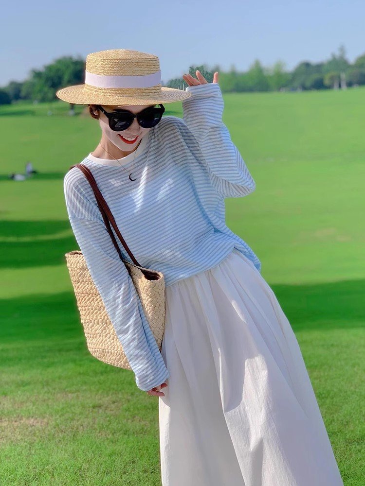 韩系蓝色条纹圆领长袖防晒t恤罩衫女夏季吊