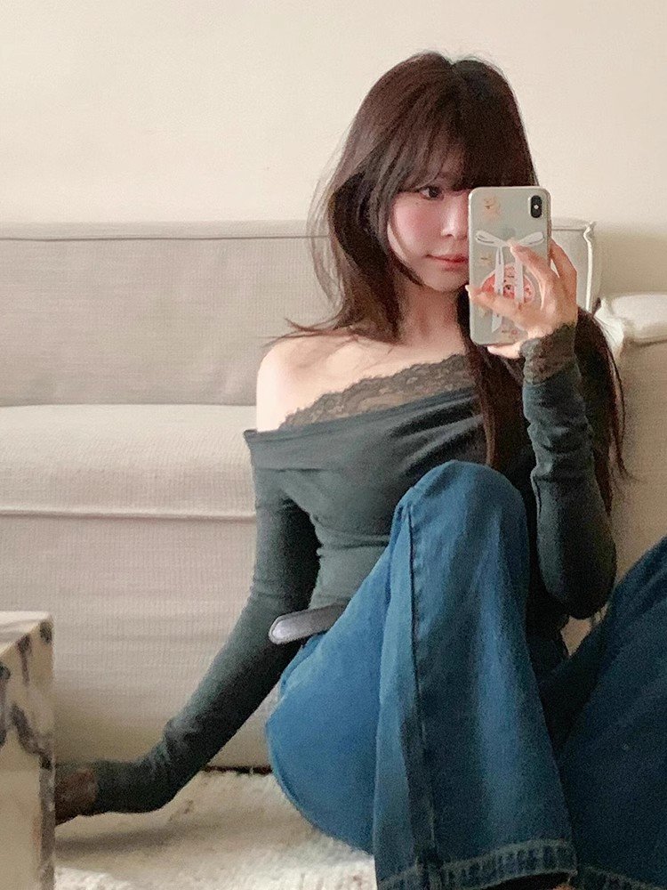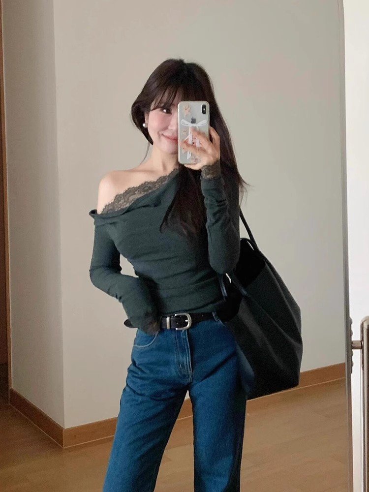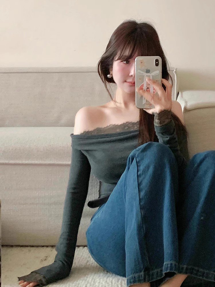 韩系灰色蕾丝斜肩长袖t恤女春秋辣妹内搭打