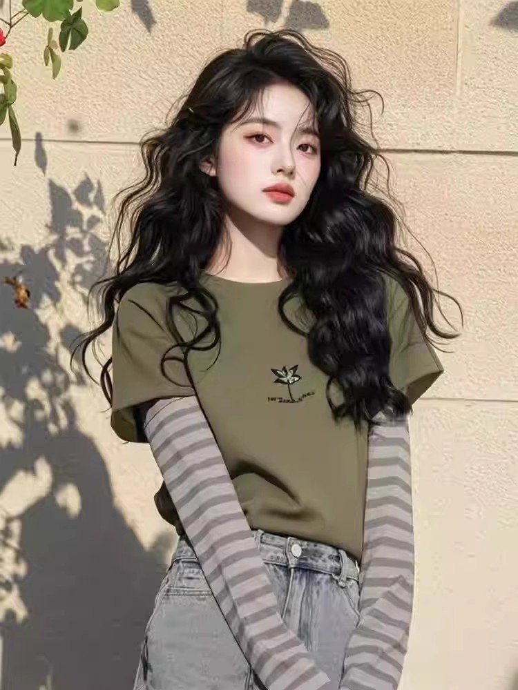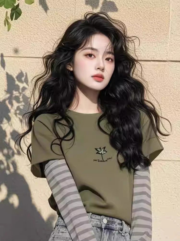 韩系绿色卡通印花假两件长袖t恤女春秋季小