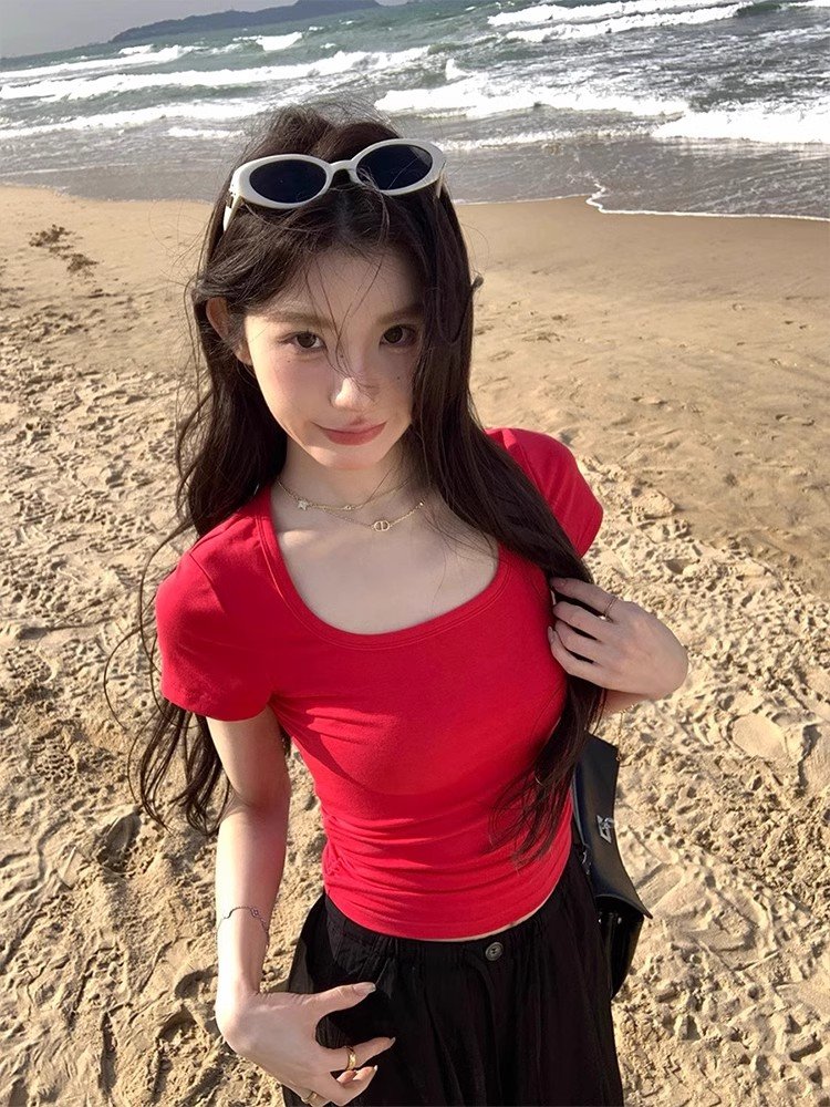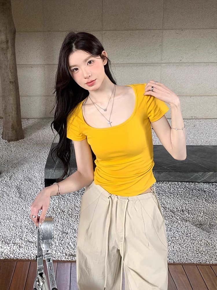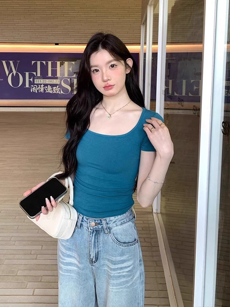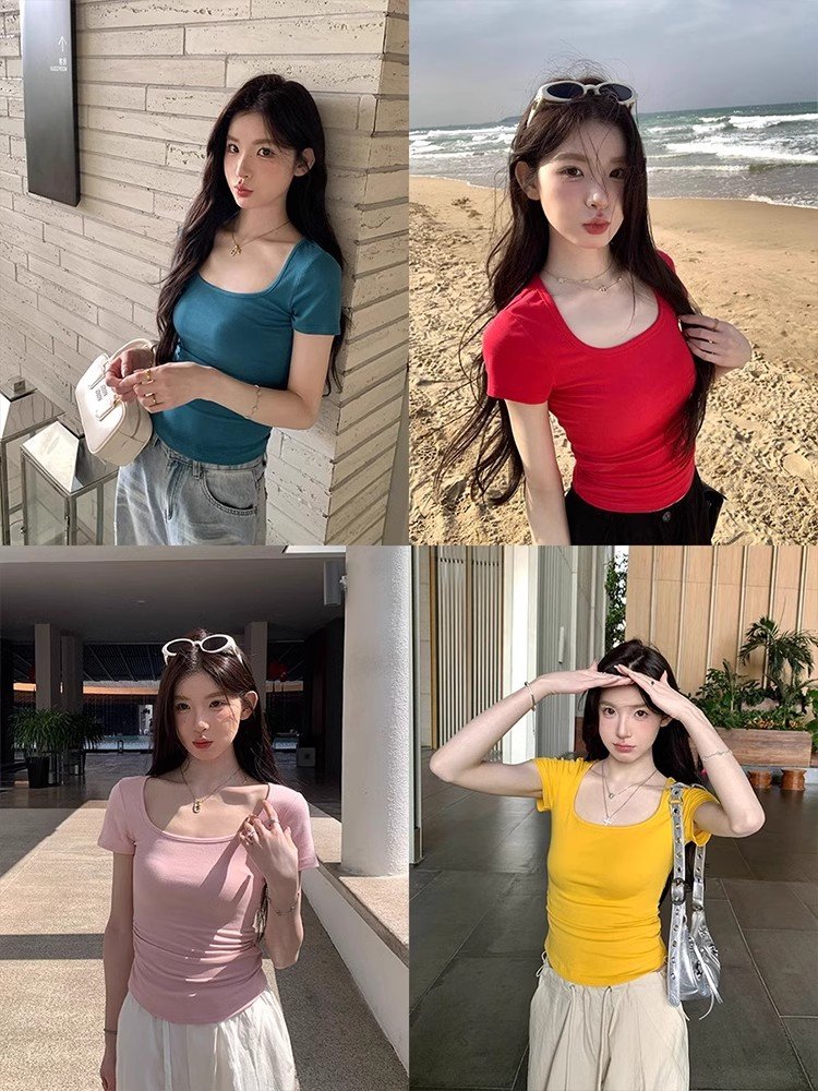 粉色大领口方领正肩短袖t恤女夏季甜辣小个