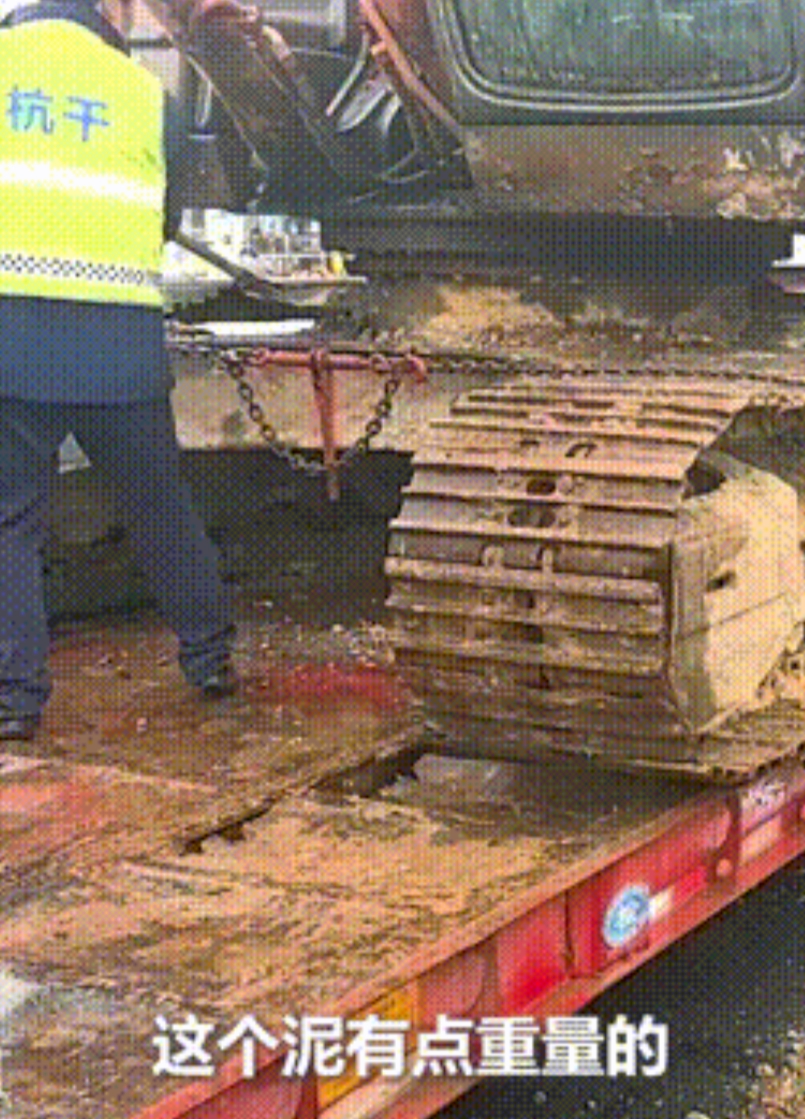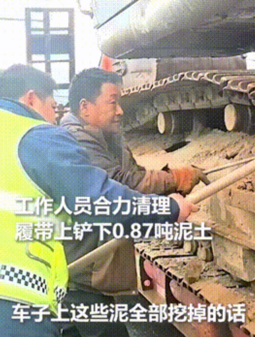 但小伙却宽慰刘师傅,超重过不去就想办法,而看了一会后,小伙直接指着挖机说出了惊人的一个神招,师傅,你这挖机履带上,泥土也太多了,把这些泥挖掉应该能轻不少。