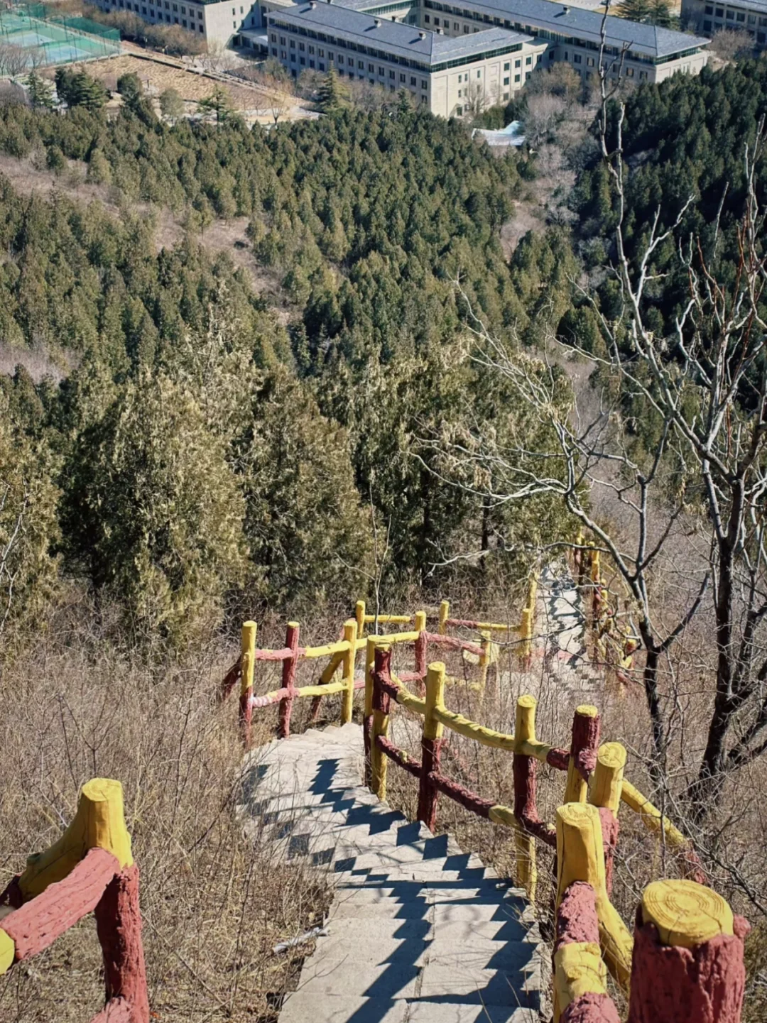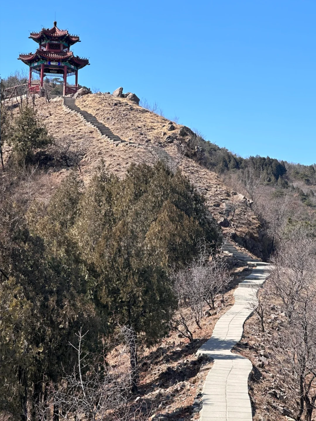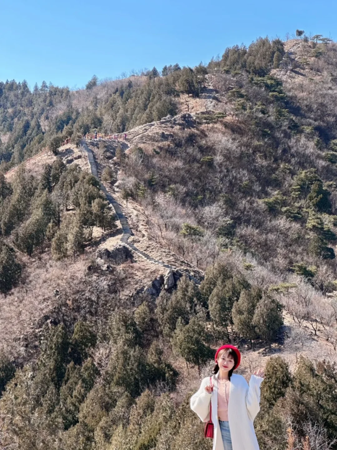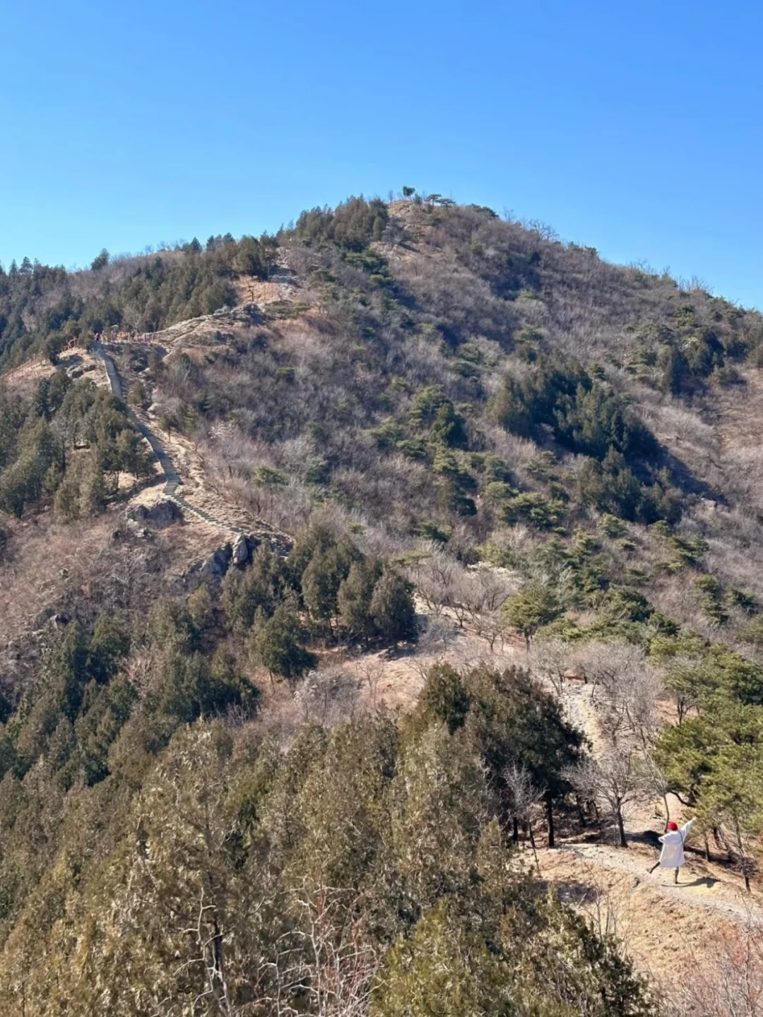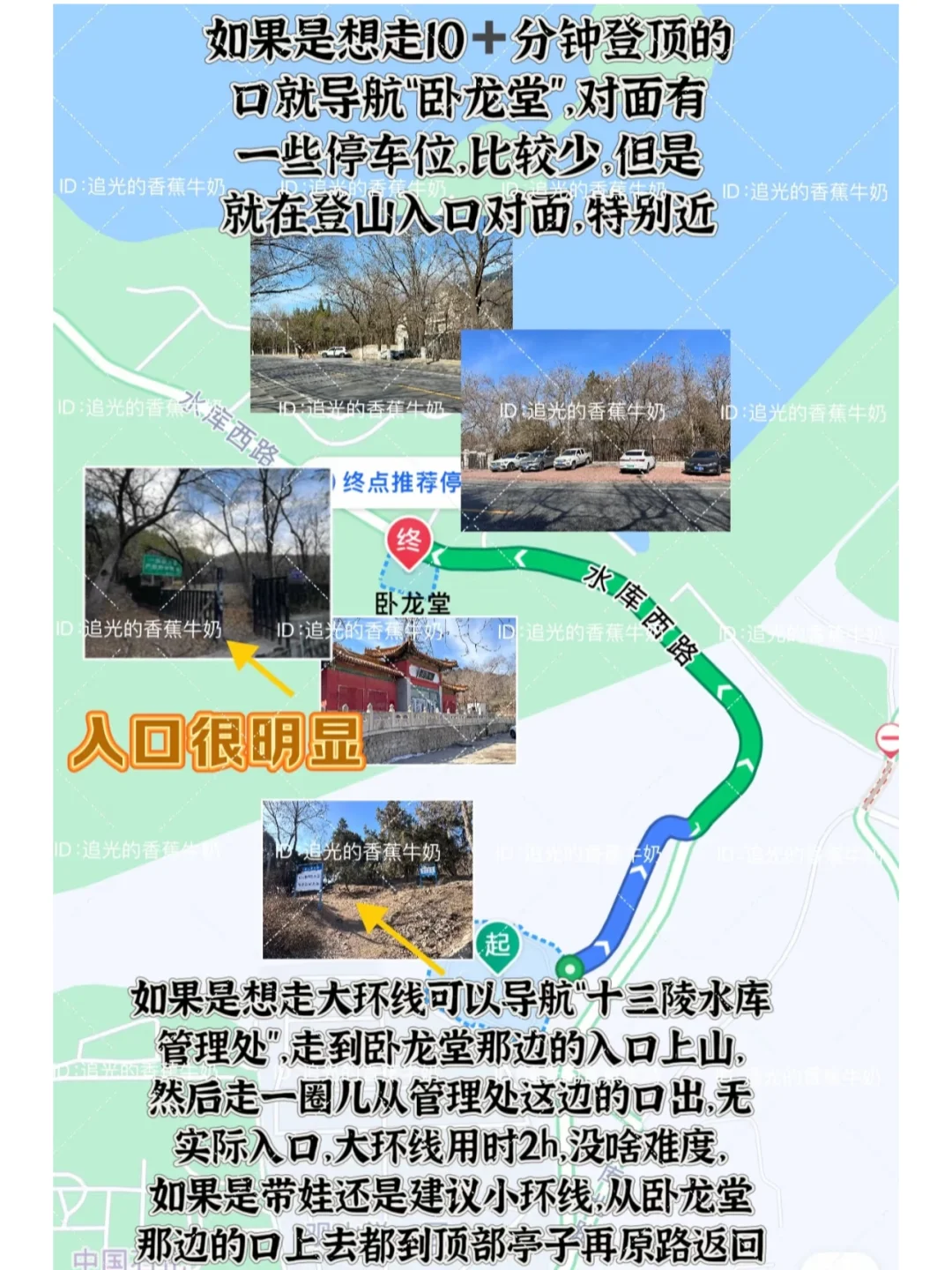 导航“卧龙堂”,对面有一些停车位,比较少,但是就在登山入口对面,特别近(到时候可以去碰下运气,如果没有位置了再回到十三陵水库管理处),从入口进入大概10➕分钟可以登顶,如果有孩子得半个小时,上去的台阶有点陡