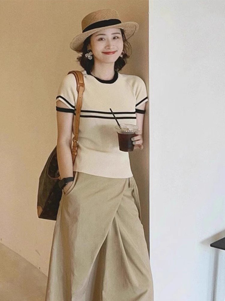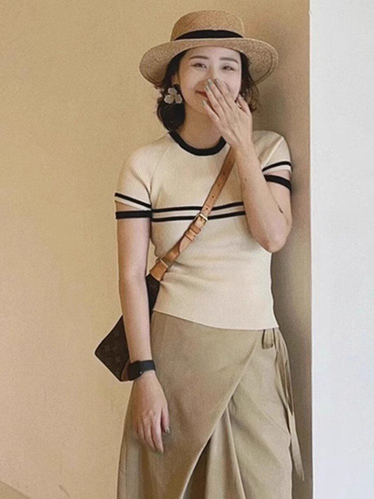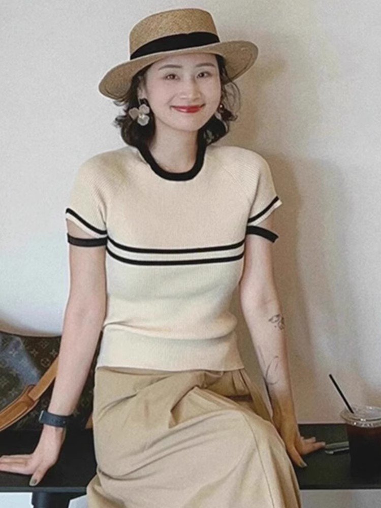 卡其色冰丝针织衫短袖正肩T恤女2025新