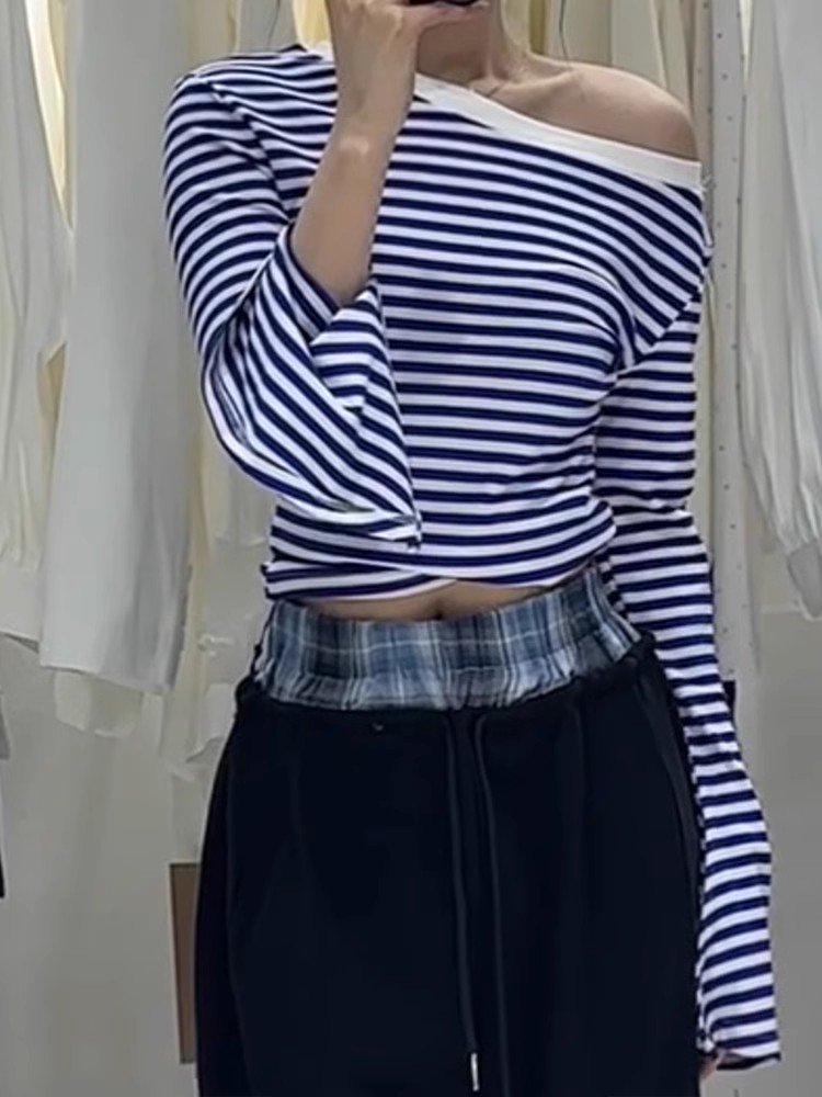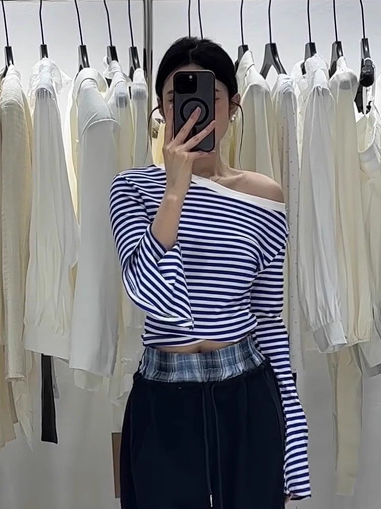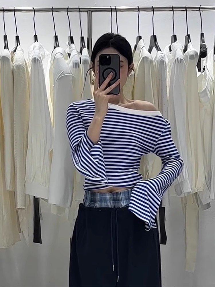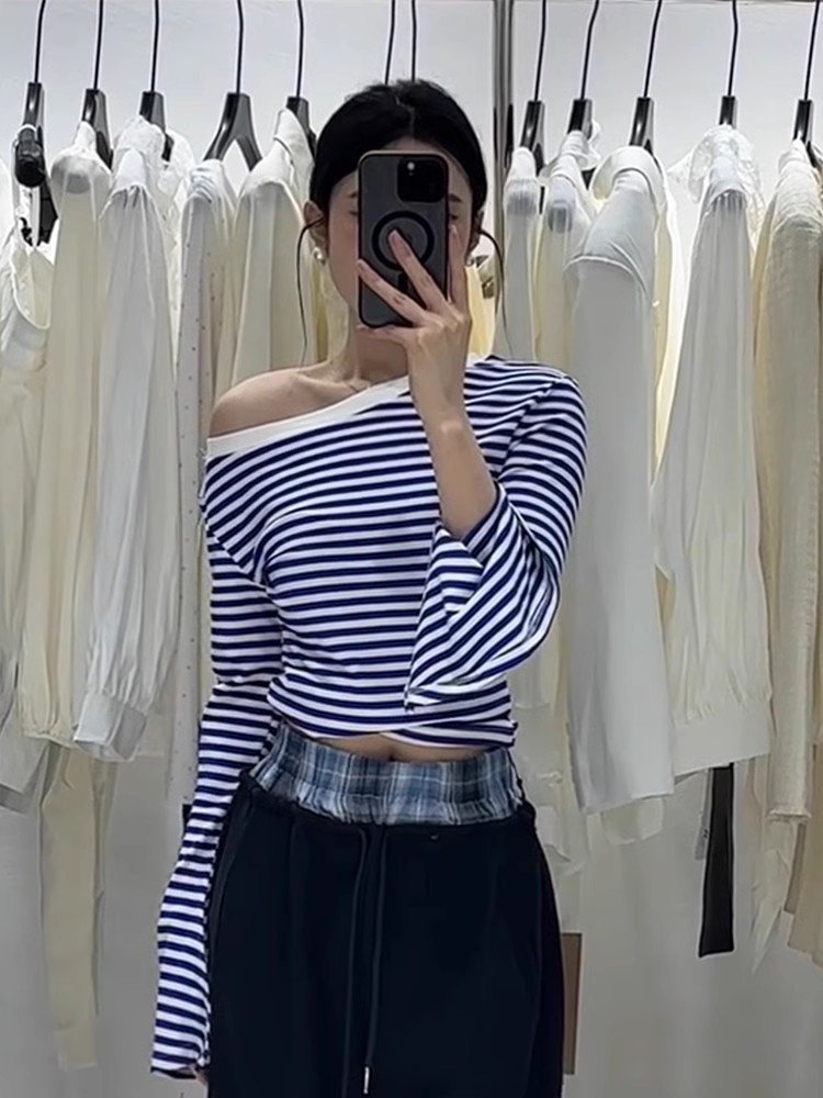 蓝色条纹斜肩喇叭袖长袖t恤女春秋季修身短