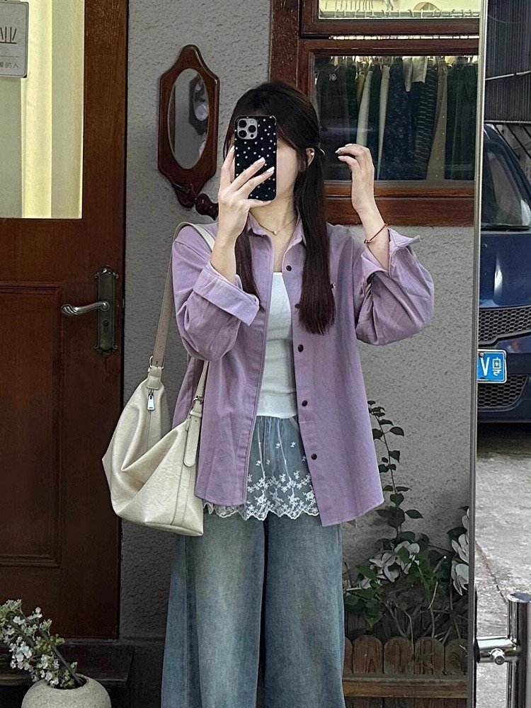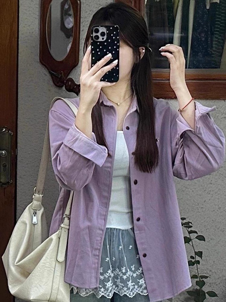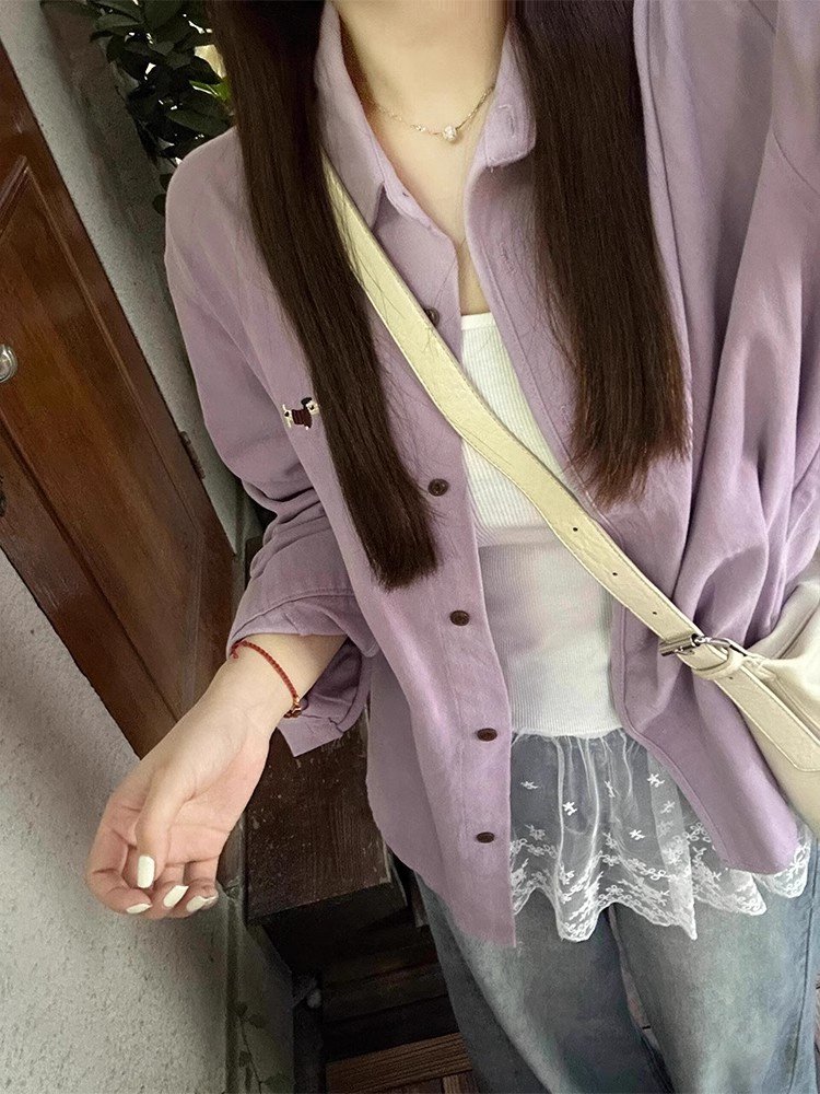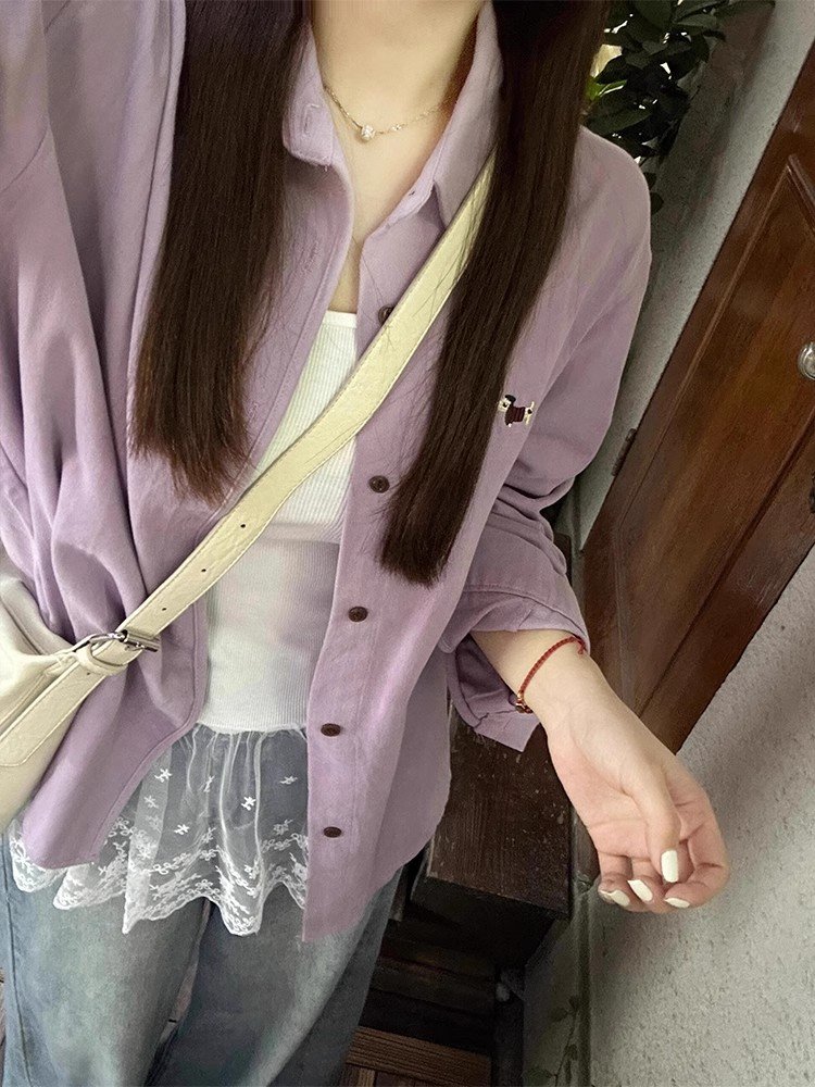 法式复古紫色Polo领长袖衬衫外套女春秋