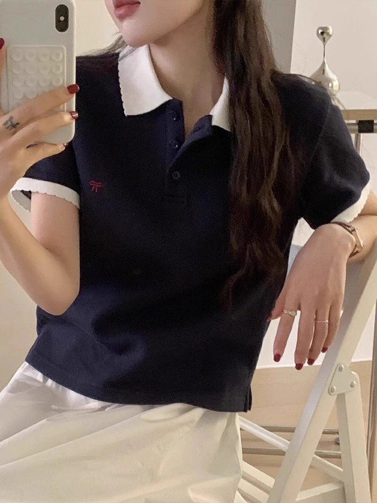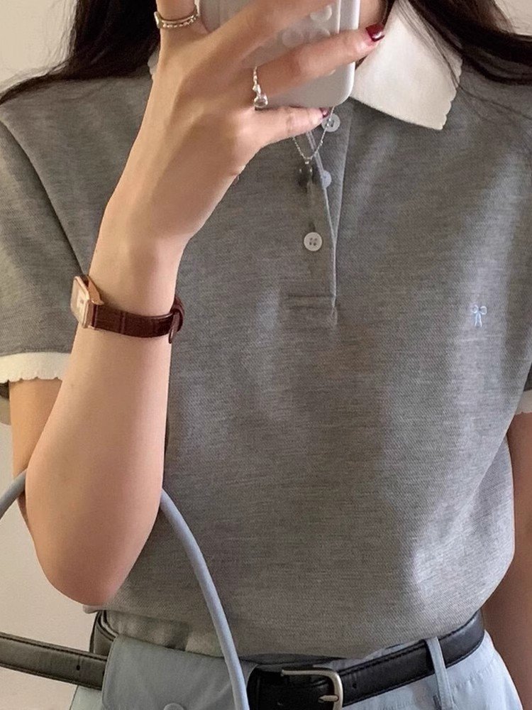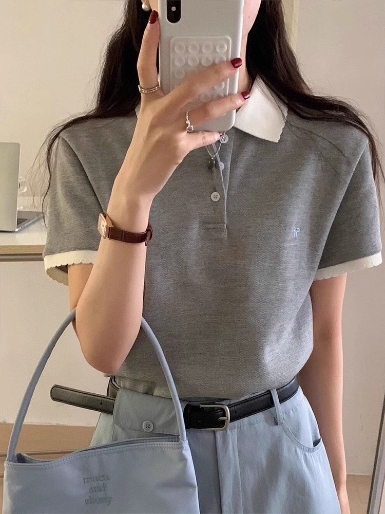 韩系灰色polo领刺绣正肩短袖t恤女夏季