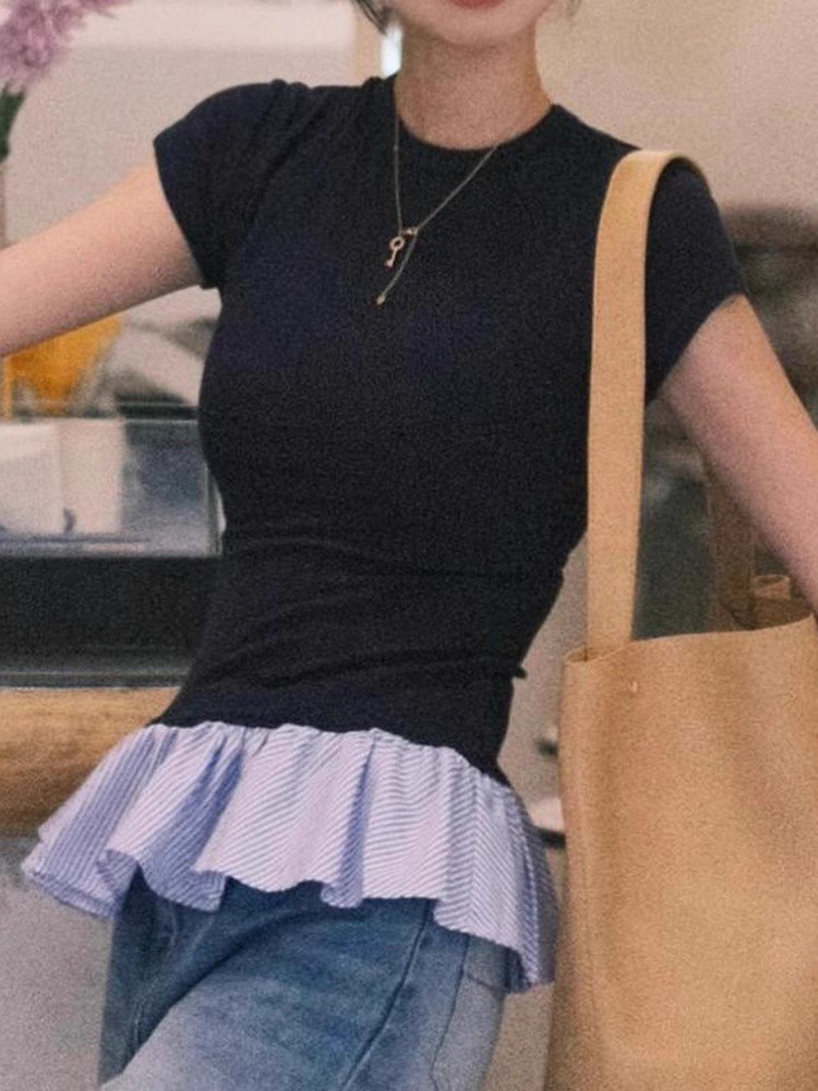 辣妹藏蓝色飞飞袖短袖正肩t恤女夏季不规则