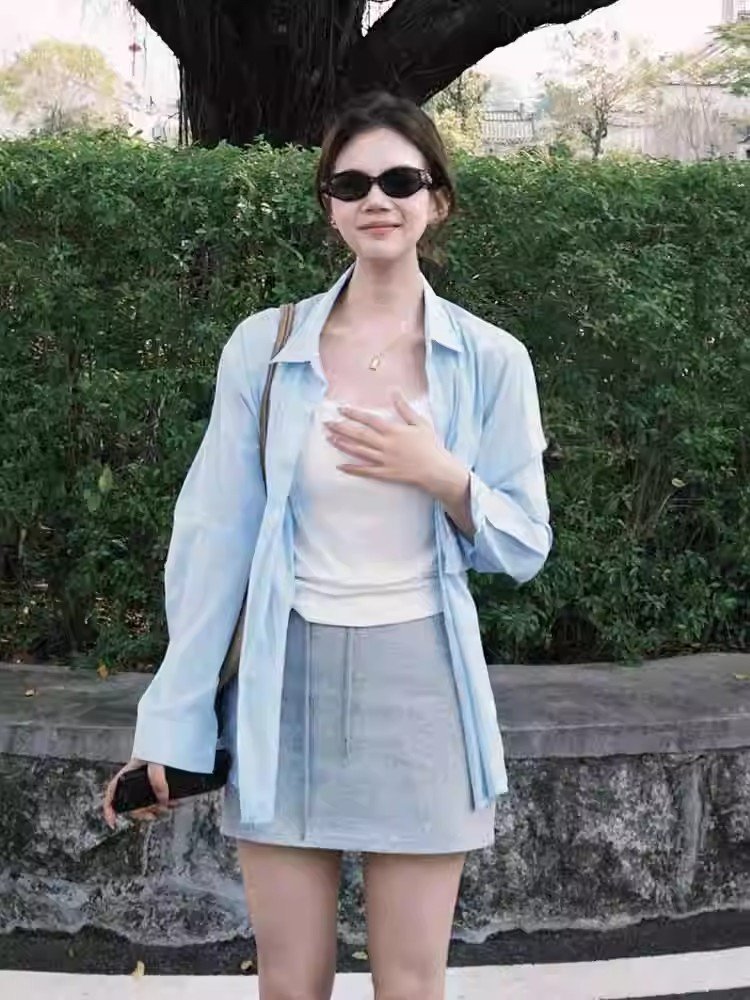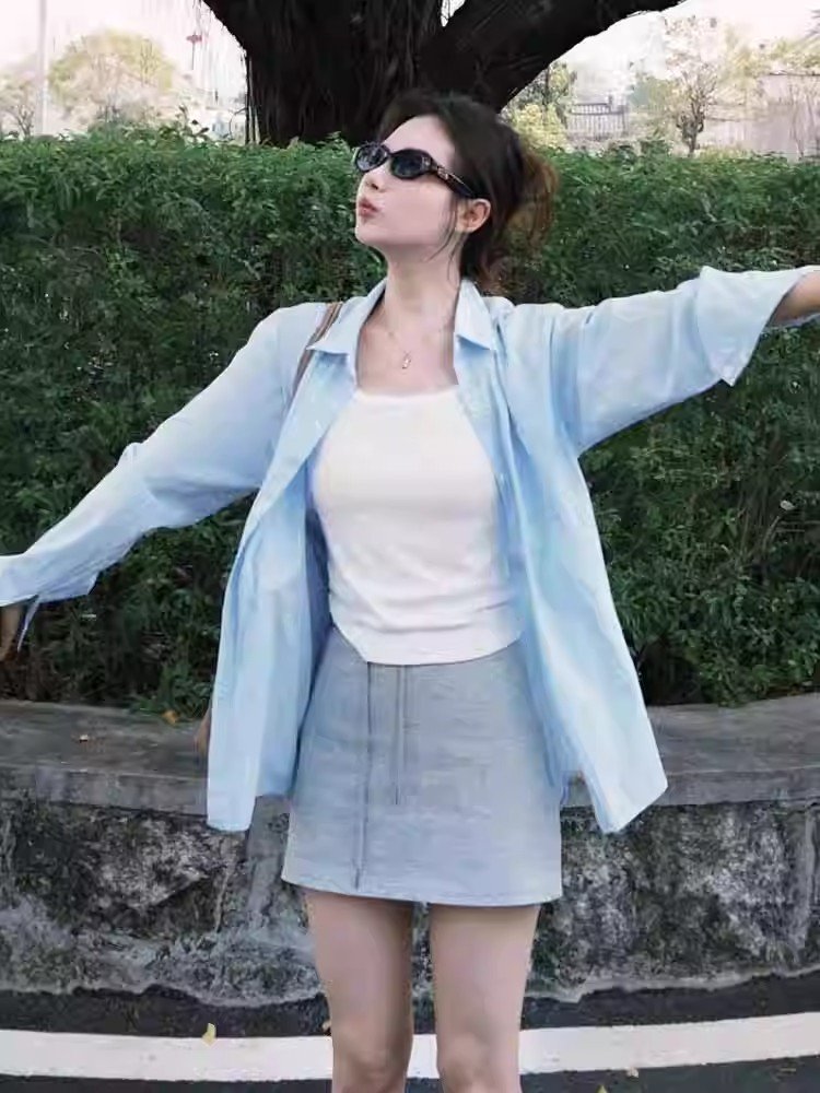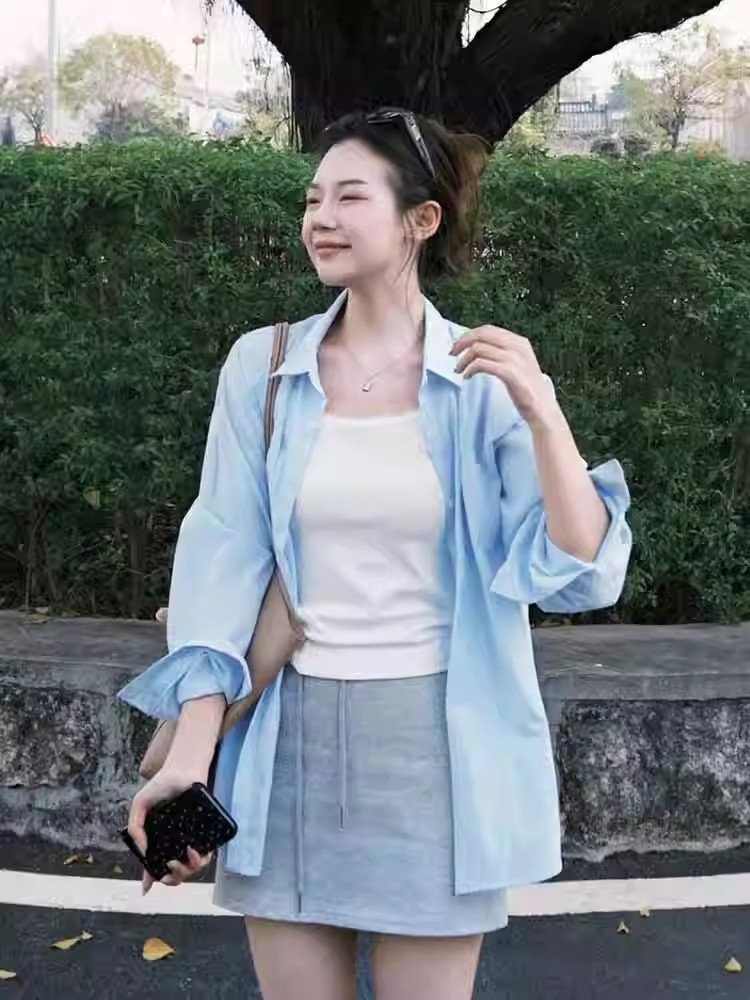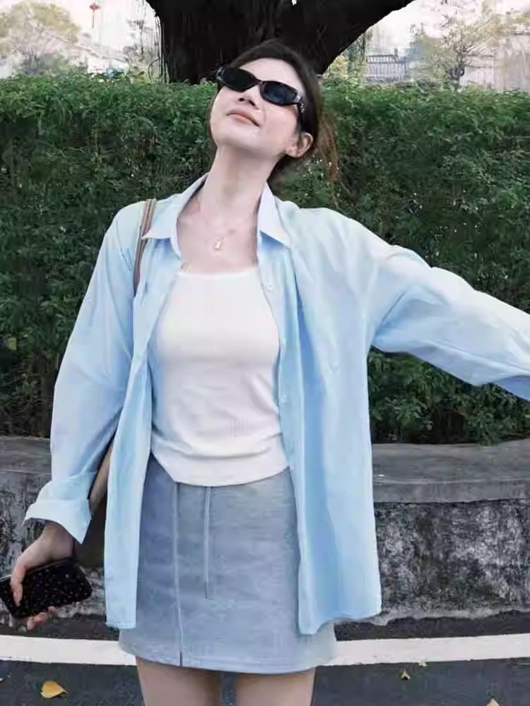 韩系蓝色polo领翻领衬衫外套女春秋外搭
