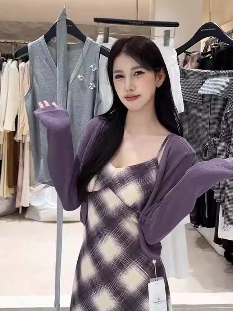 法式气质撞色格子无袖吊带连衣裙女夏季小个