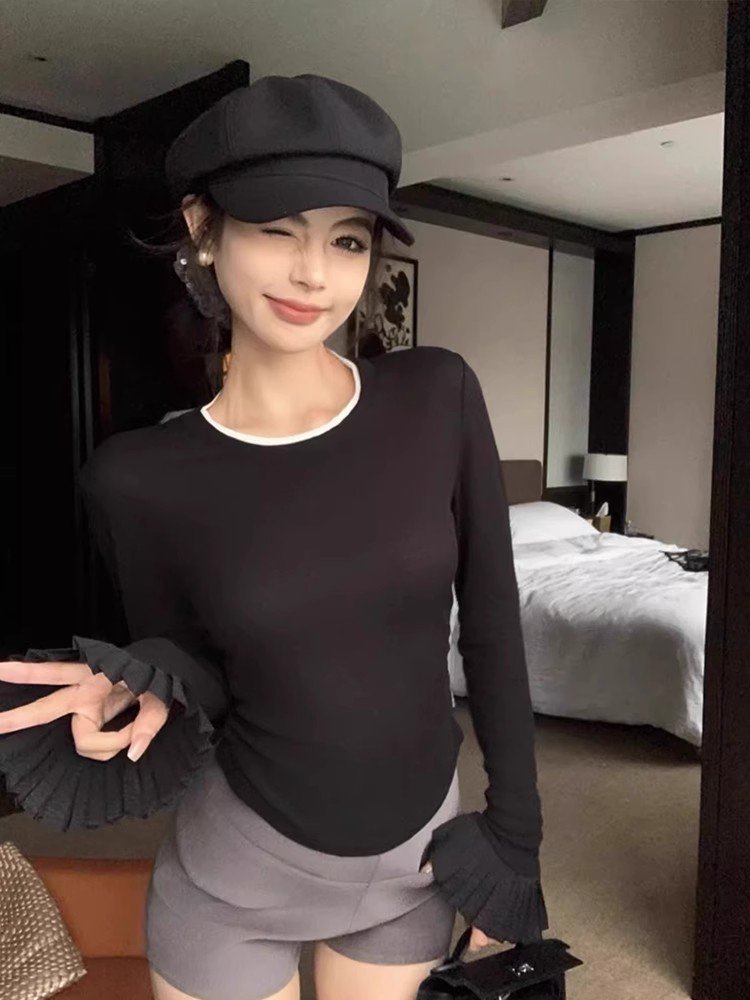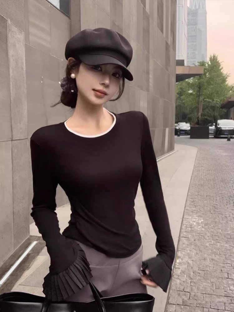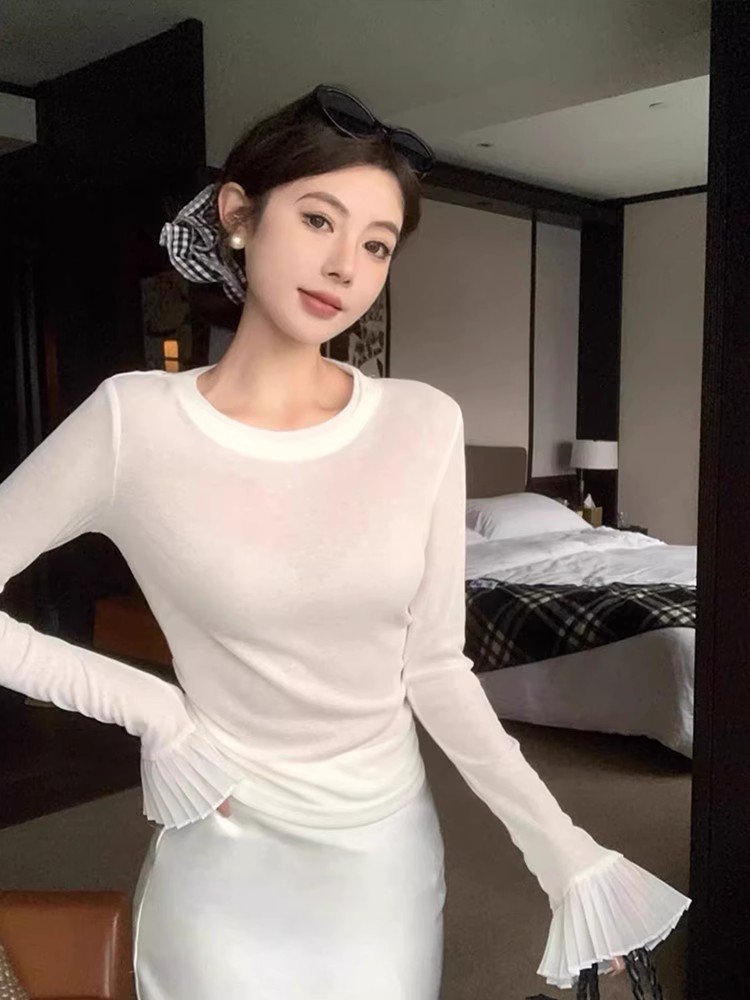 韩系内搭白色圆领喇叭袖长袖t恤女春秋季修