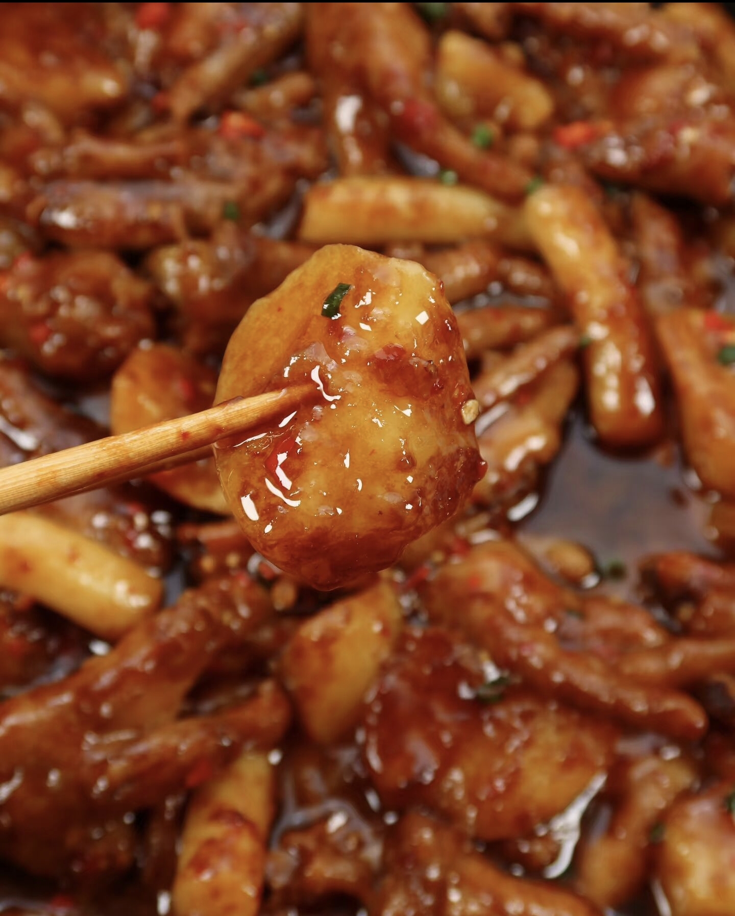 收汁最考验耐心。火调大让汤汁快速变稠,铲子不停翻动,鸡爪年糕在锅里"咕嘟咕嘟"翻滚,裹上一层亮晶晶的酱汁。汤汁浓稠到能挂住鸡爪,像蜂蜜一样拉丝,赶紧关火。撒点白芝麻和葱花,出锅装盘时动作要轻,太用力就碎了。