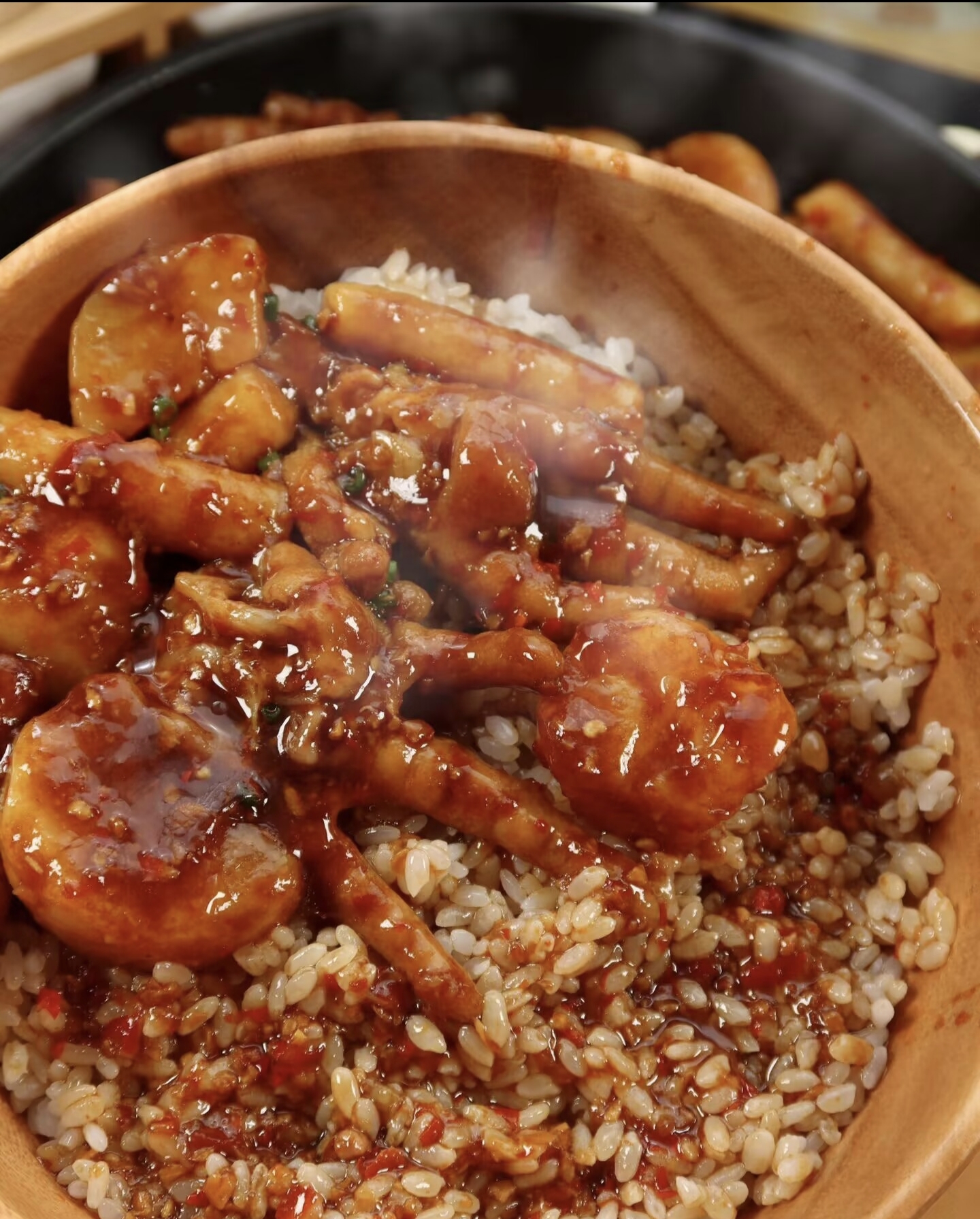 刚出锅的鸡爪年糕,红亮酱汁裹在颤巍巍的鸡爪上,看着就馋。夹起一块鸡爪,嘴唇一抿肉就下来了,胶质十足粘嘴巴,特别过瘾。年糕软糯Q弹,满嘴卤香。汤汁拌饭更是一绝,我家儿子每次都要多盛半碗饭"打扫"盘子。