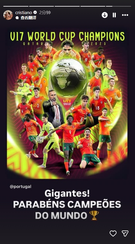 赛后,葡萄牙的头号球星C罗也在社交媒体上发文,向这支年轻的国家队表达了祝贺。他转发了葡萄牙国家队官方发布的夺冠海报,并配文道:“好样的,祝贺你们,世界冠军!”