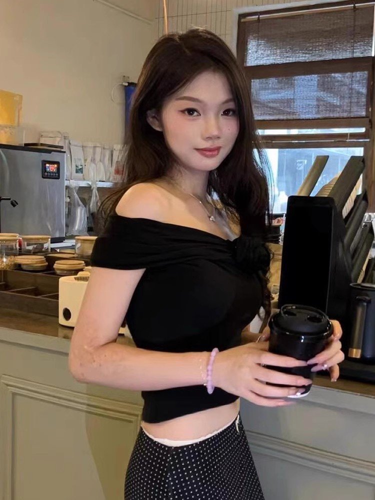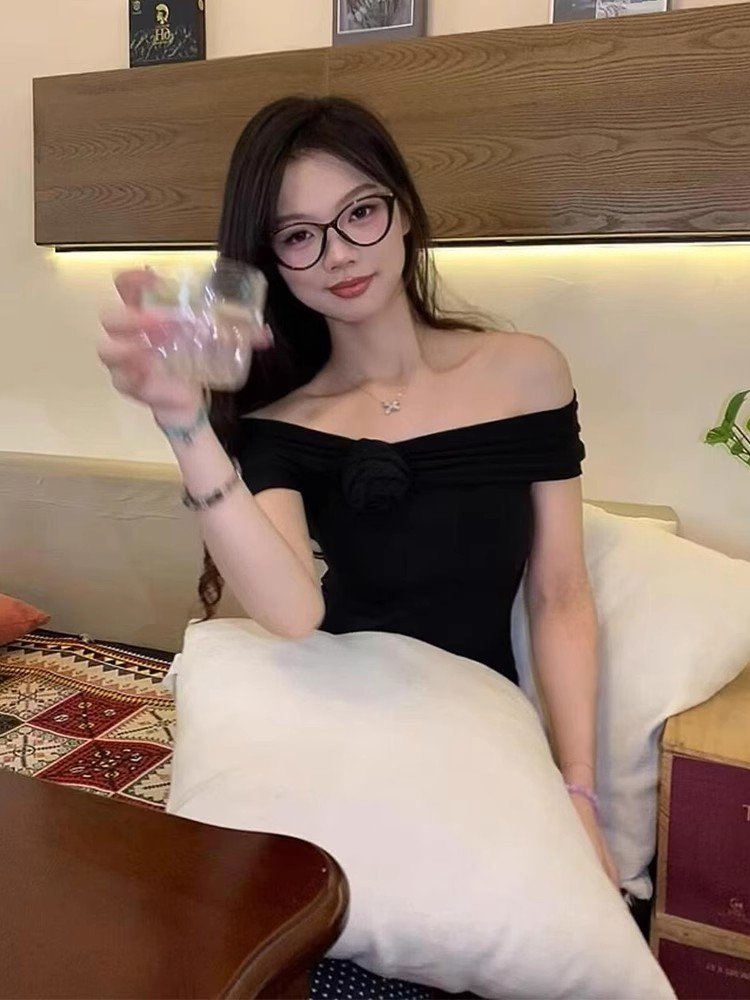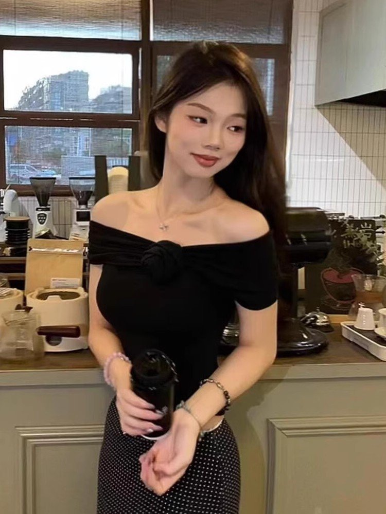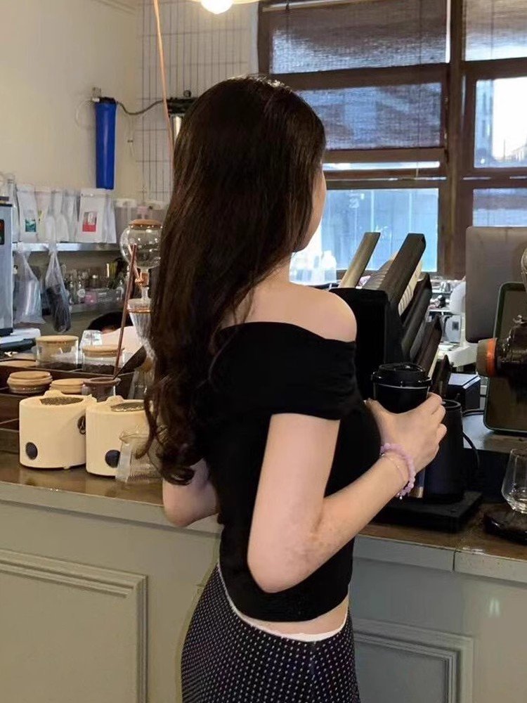 法式甜辣黑色一字肩露肩短袖t恤女夏季小个