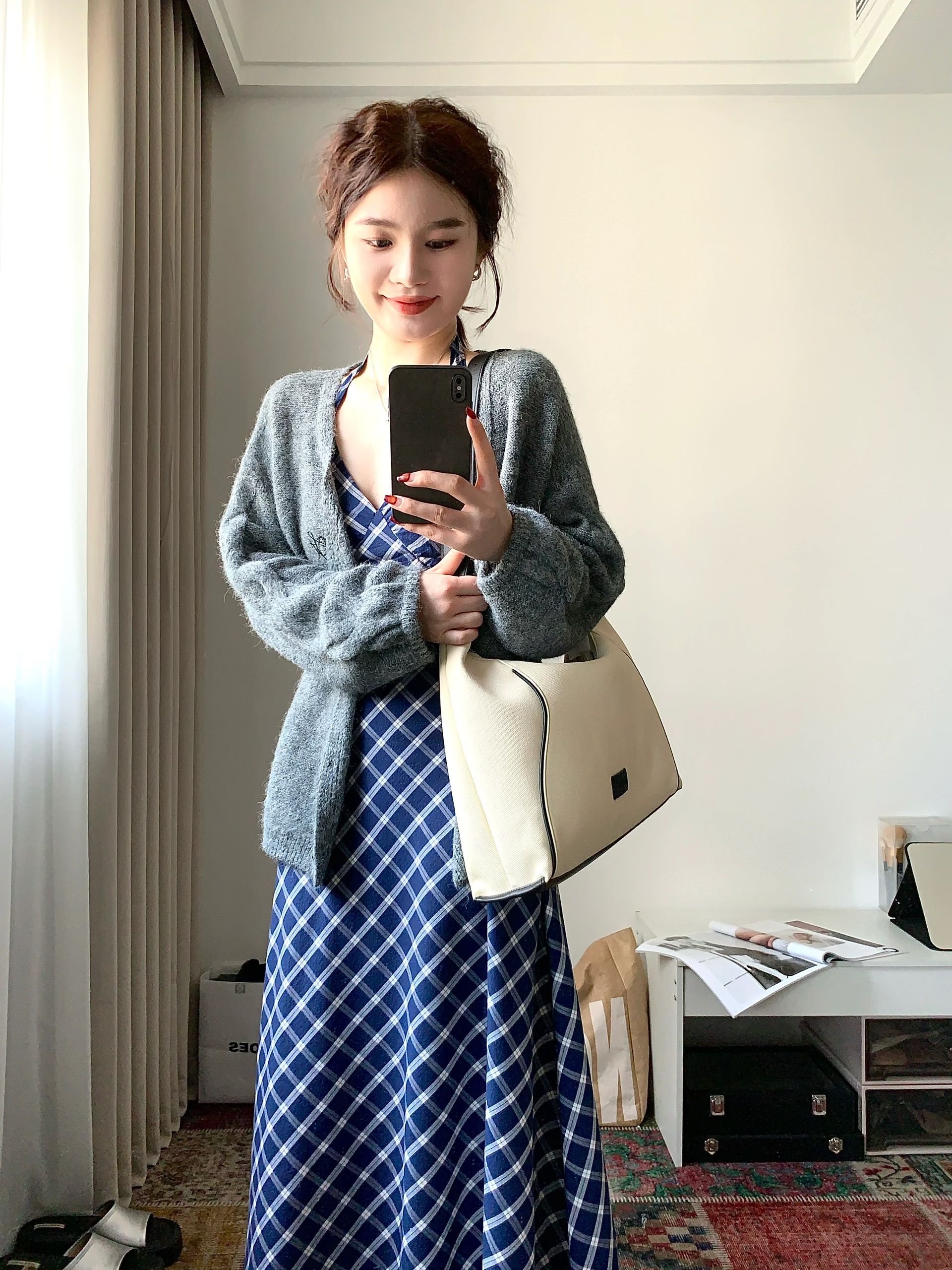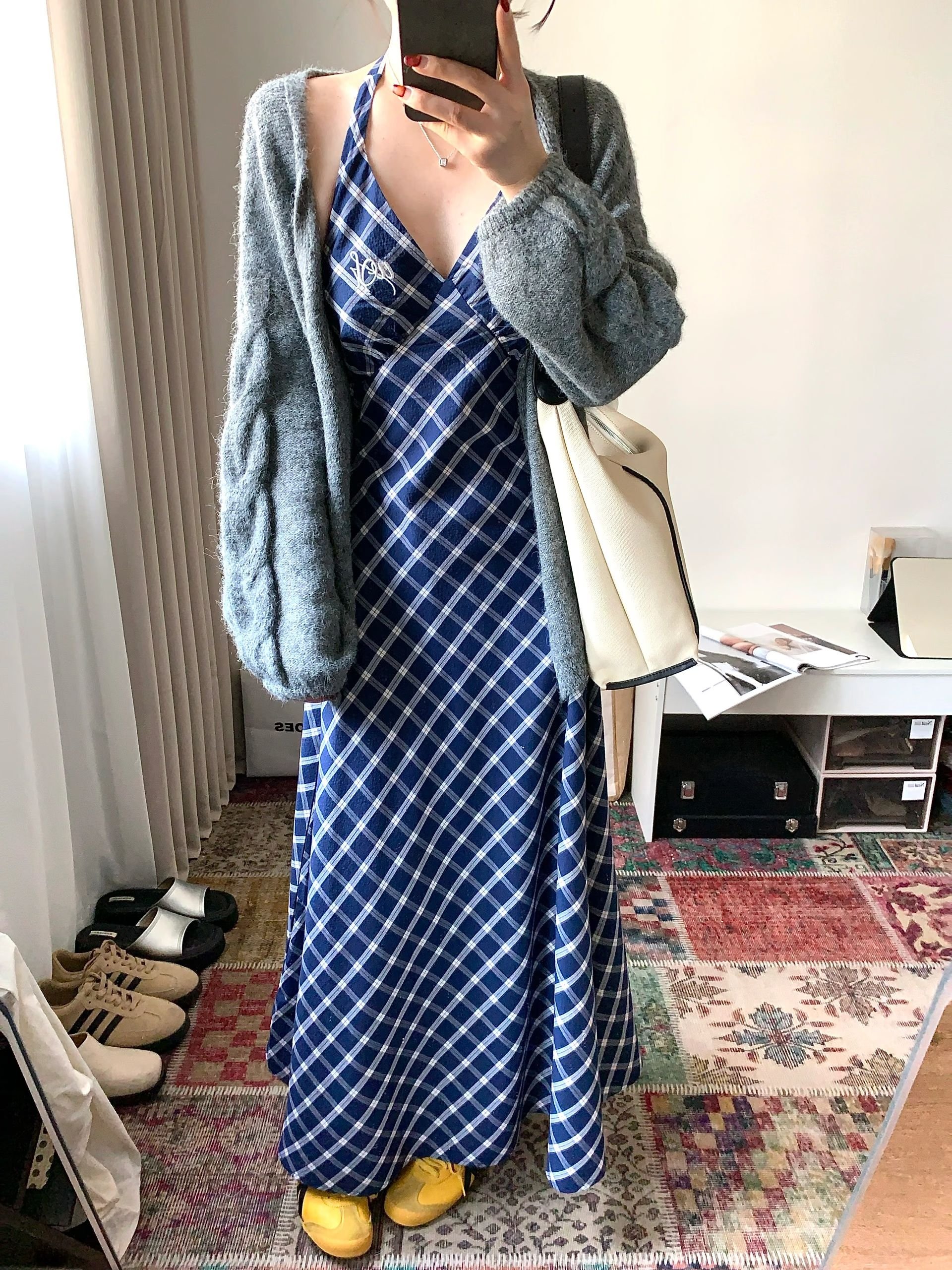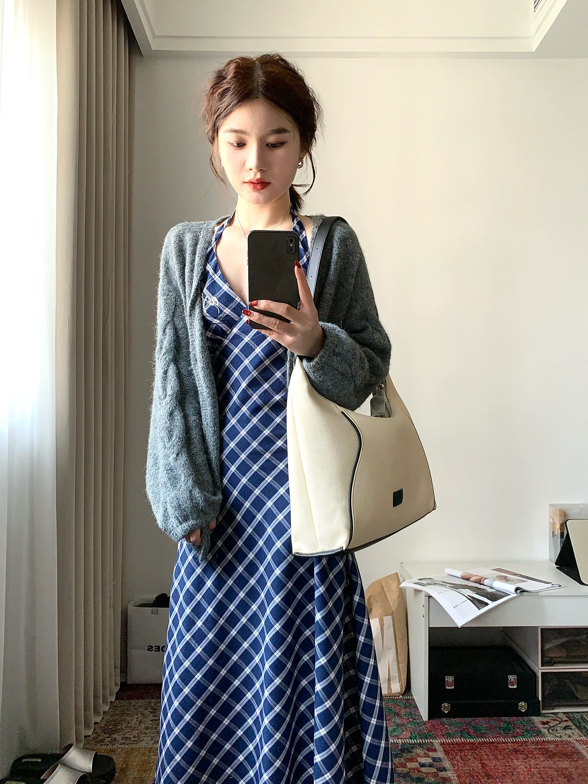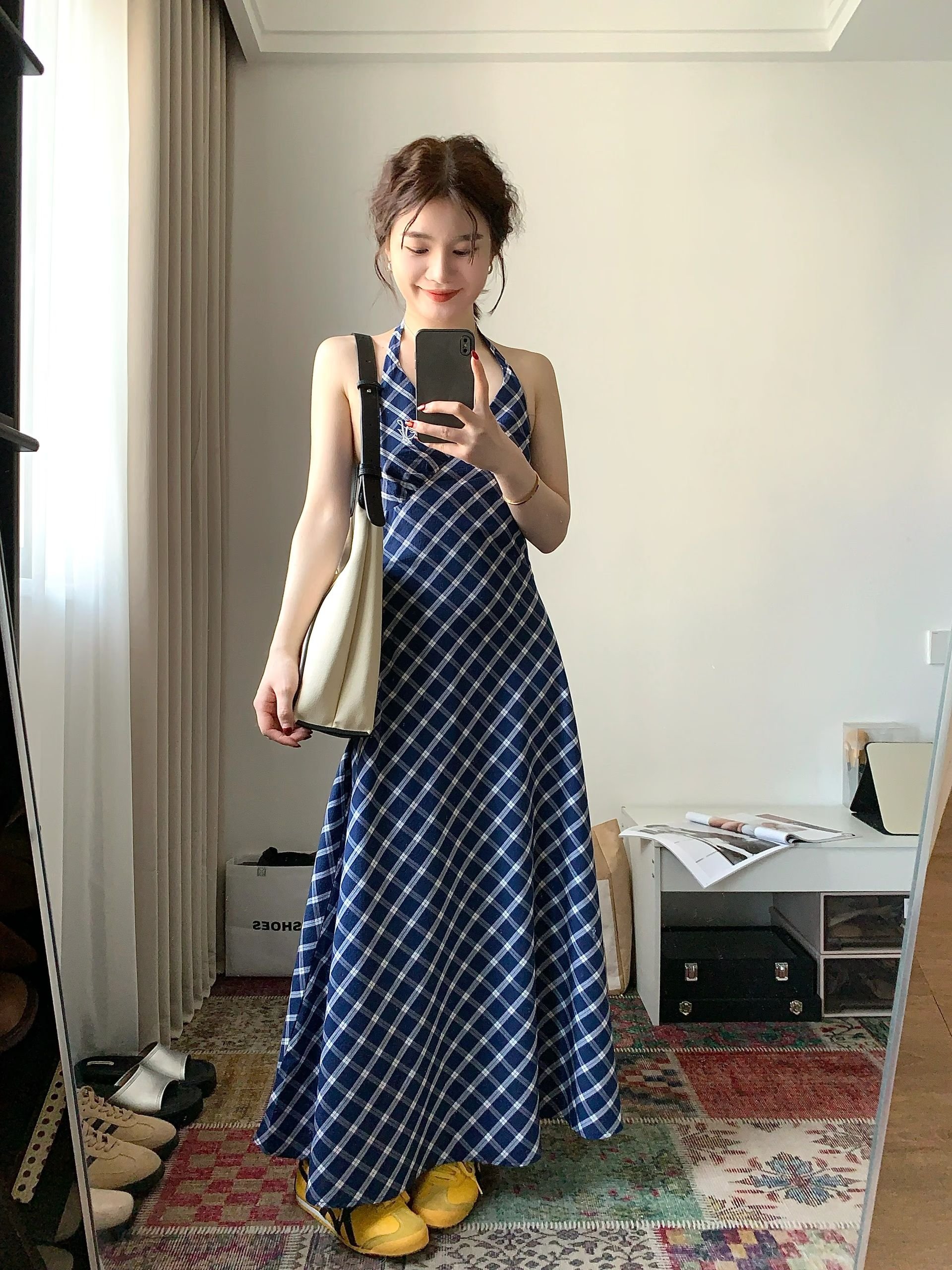 法式蓝色格子挂脖v领无袖连衣裙女夏季海边