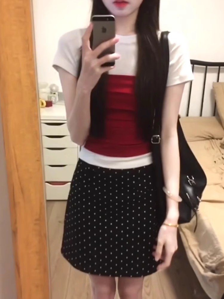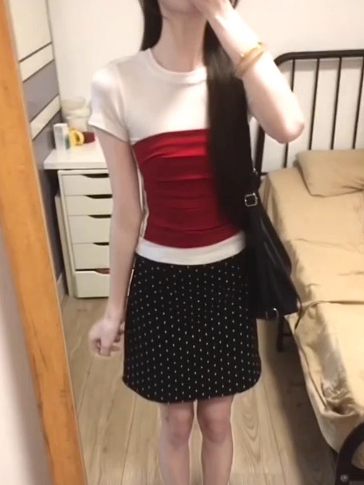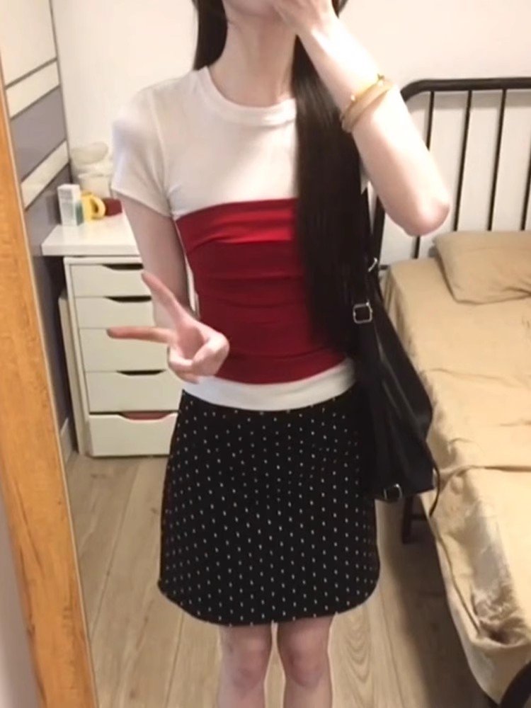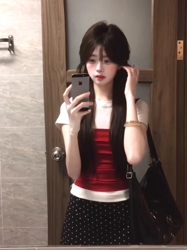 辣妹撞色假两件正肩短袖t恤女夏季2025