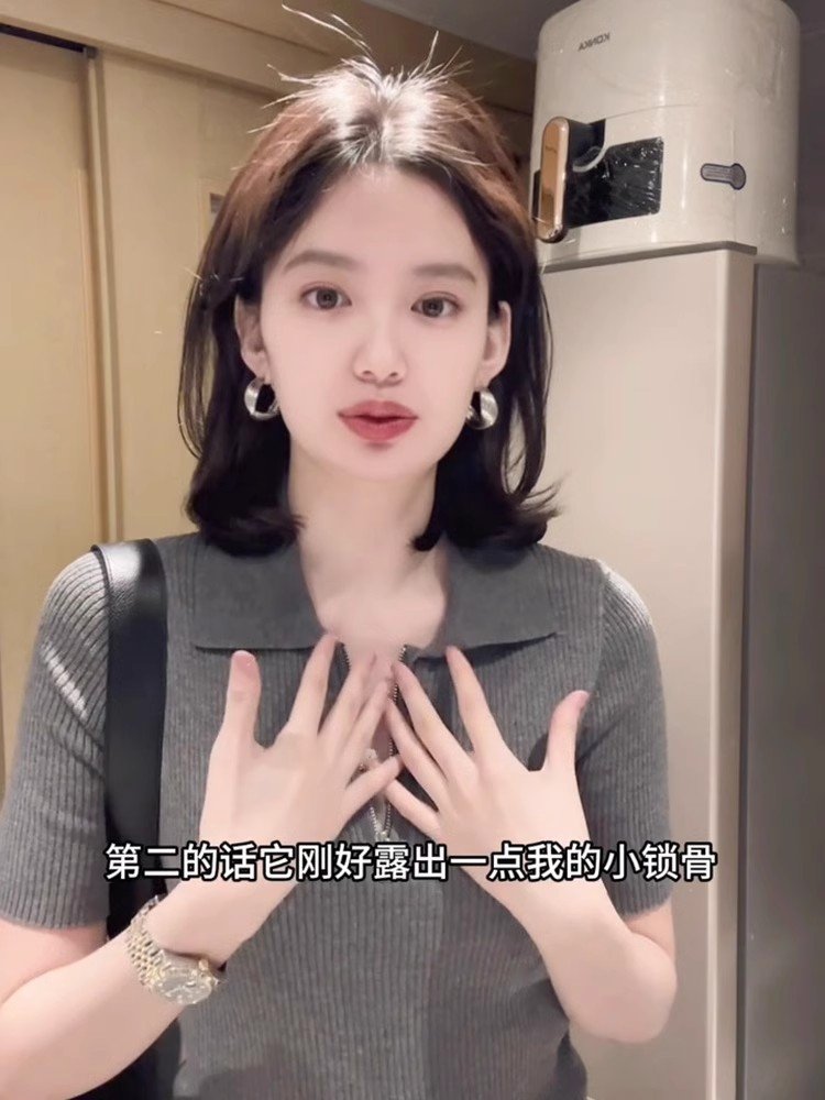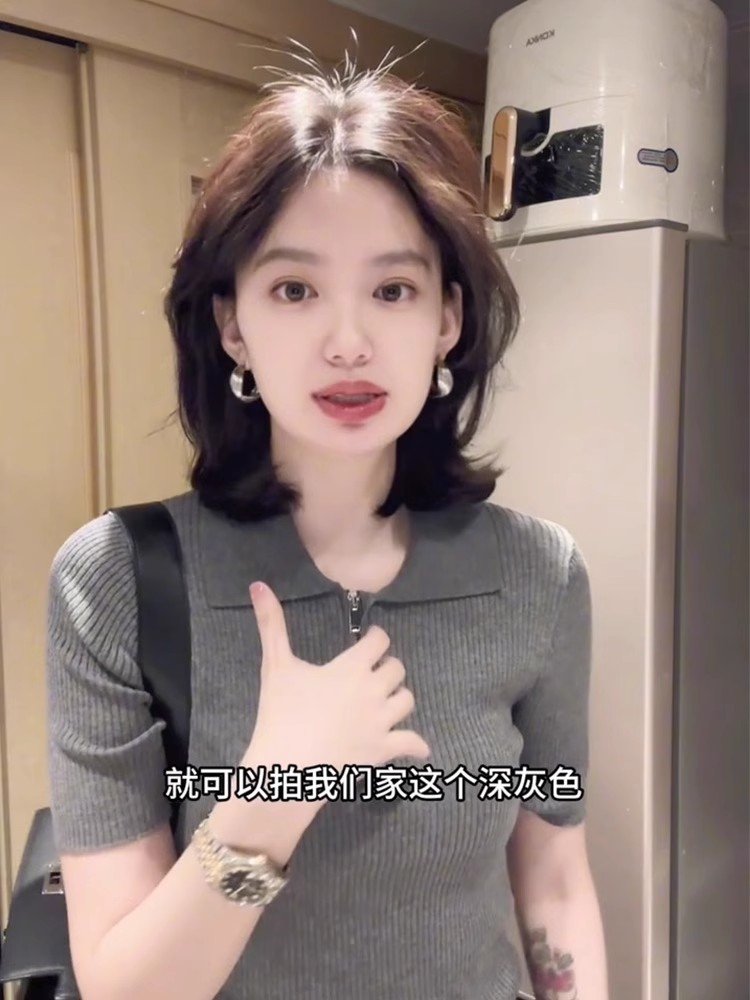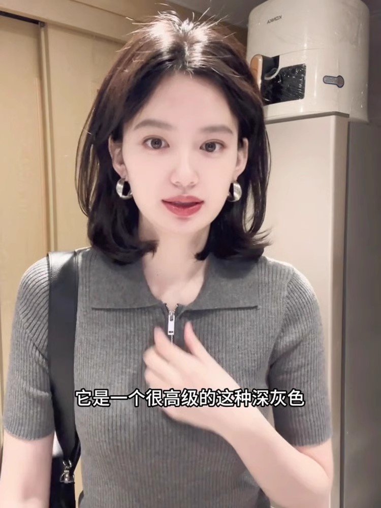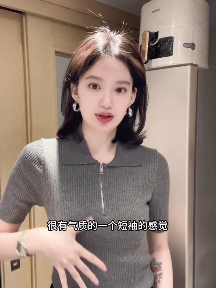 法式灰色拉链翻领正肩短恤t恤冰丝针织PO