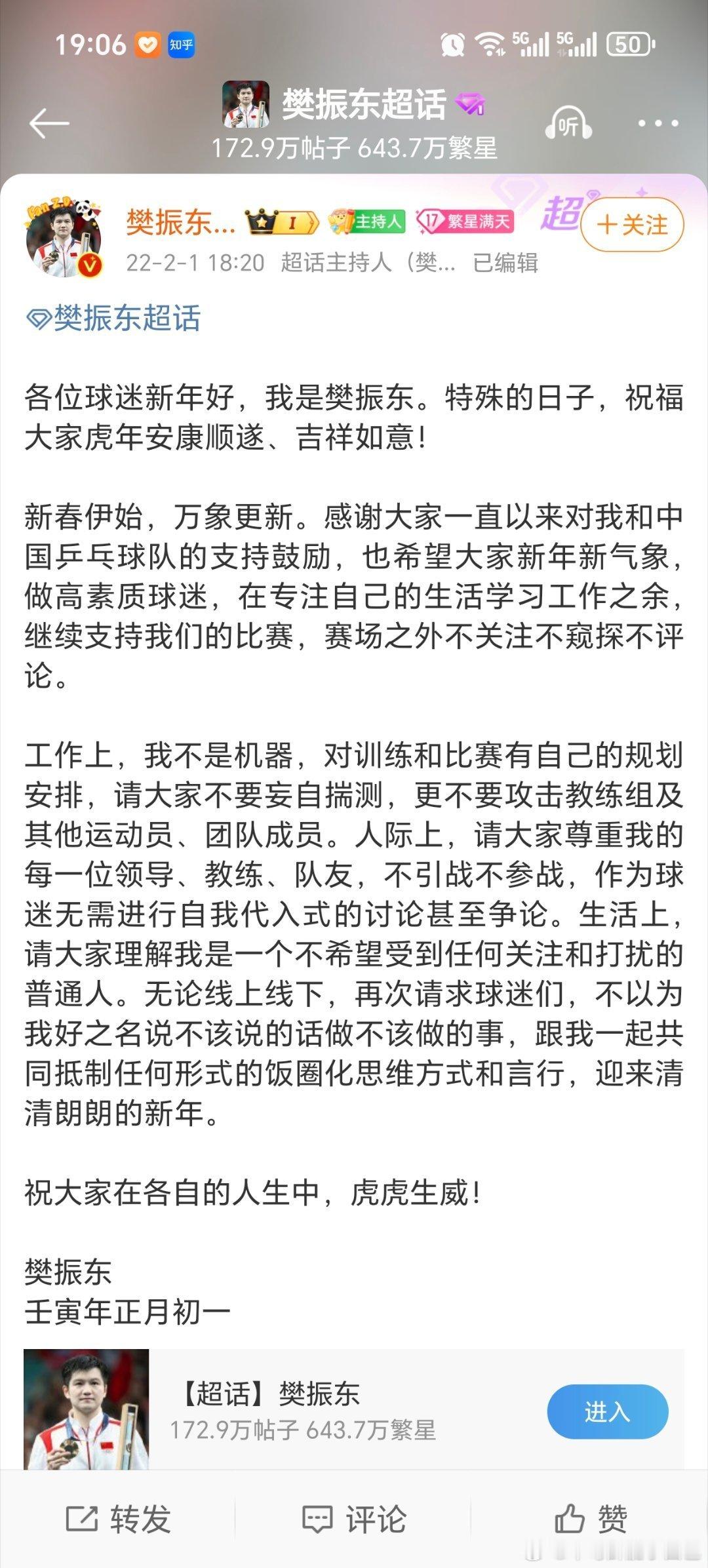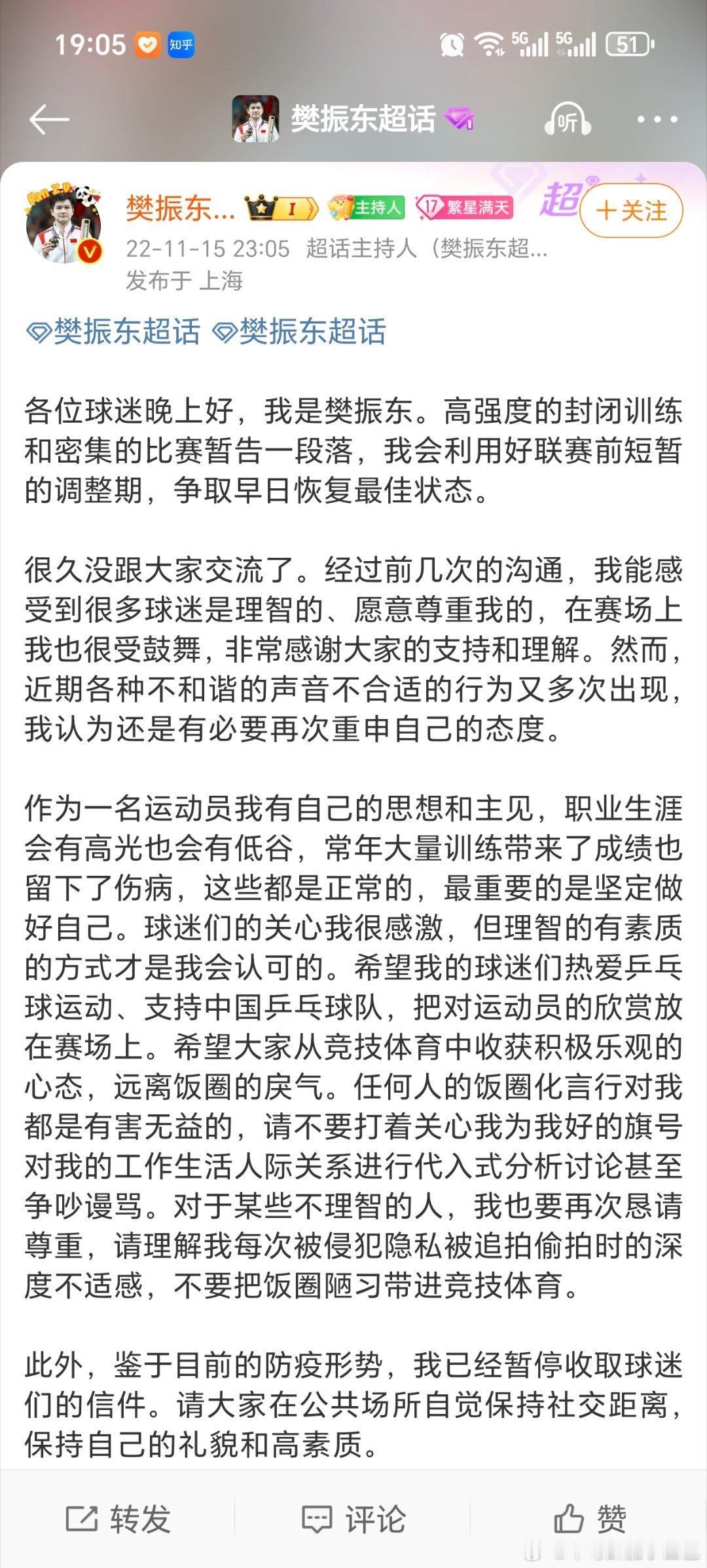 自21年起樊振东多次发声正确引导球迷[拳头]