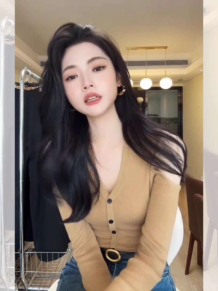 卡其色v领露肩修身内搭打底衫上衣女春秋2