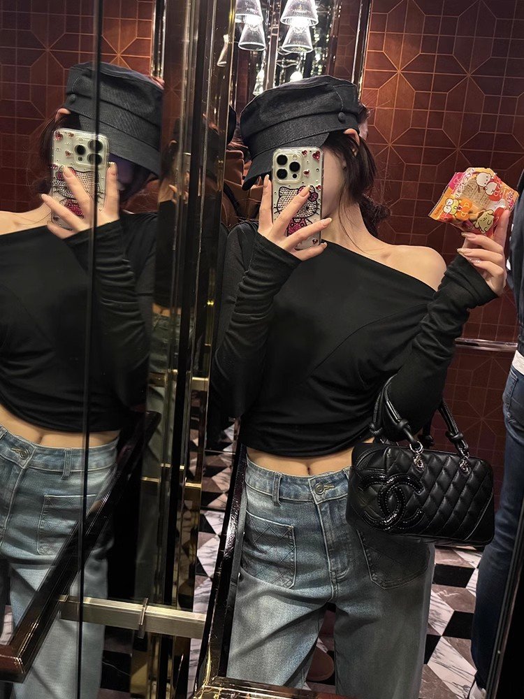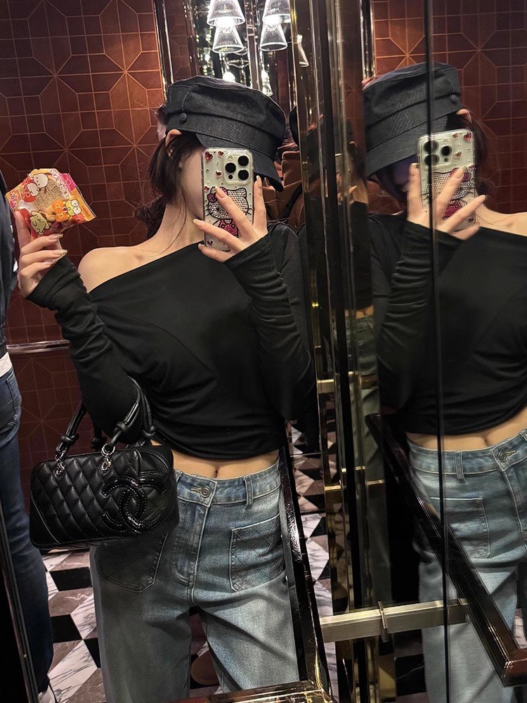 辣妹黑色一字肩低领长袖t恤女春秋季后背镂