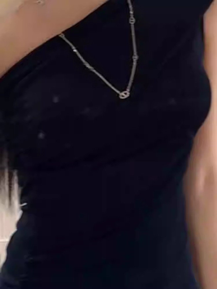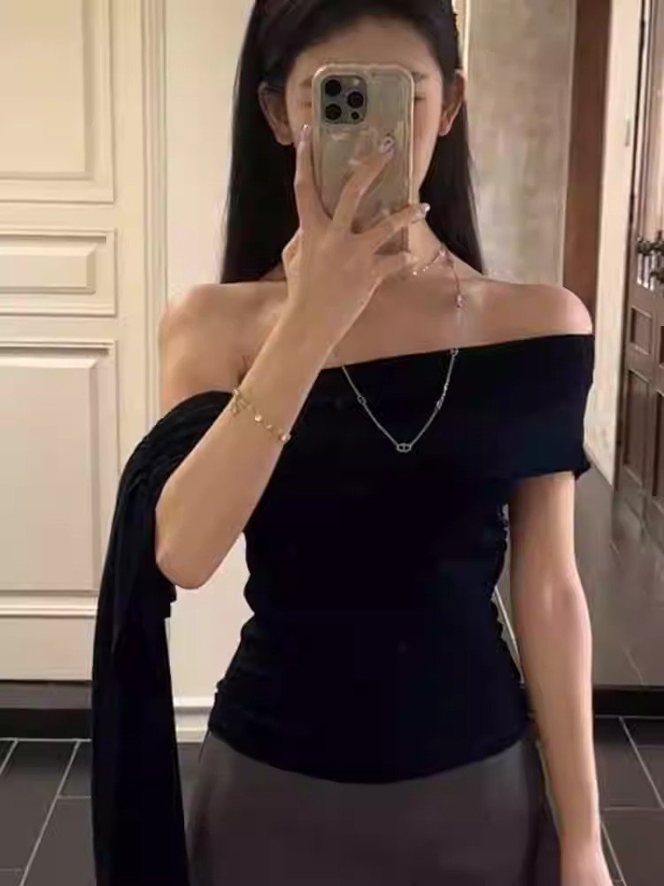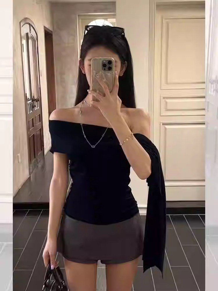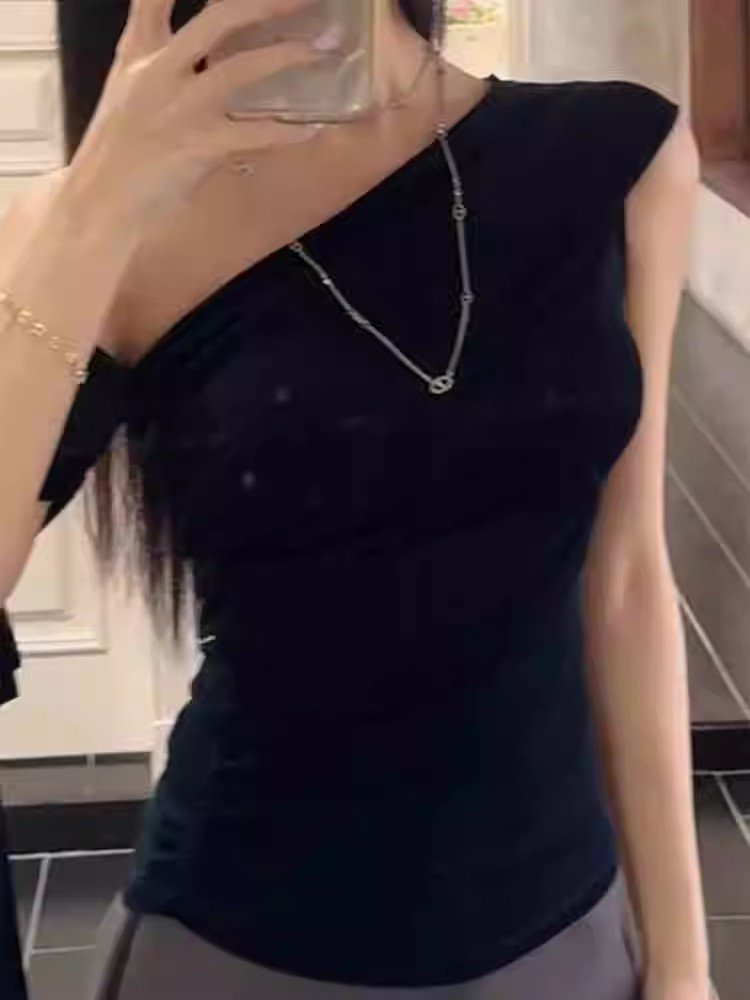 美式辣妹藏蓝色斜肩飘带短袖t恤女夏季高级
