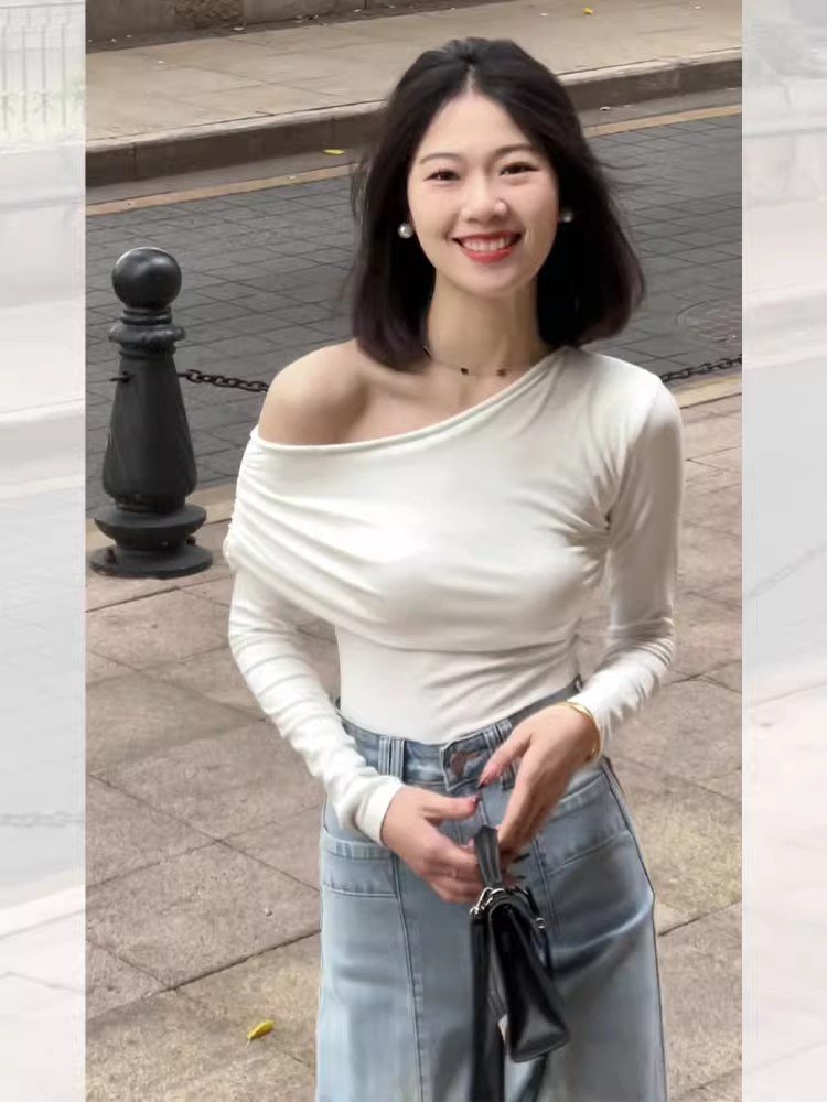 假两件短款白色斜肩长袖t恤打底衫女春秋内