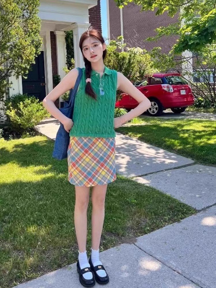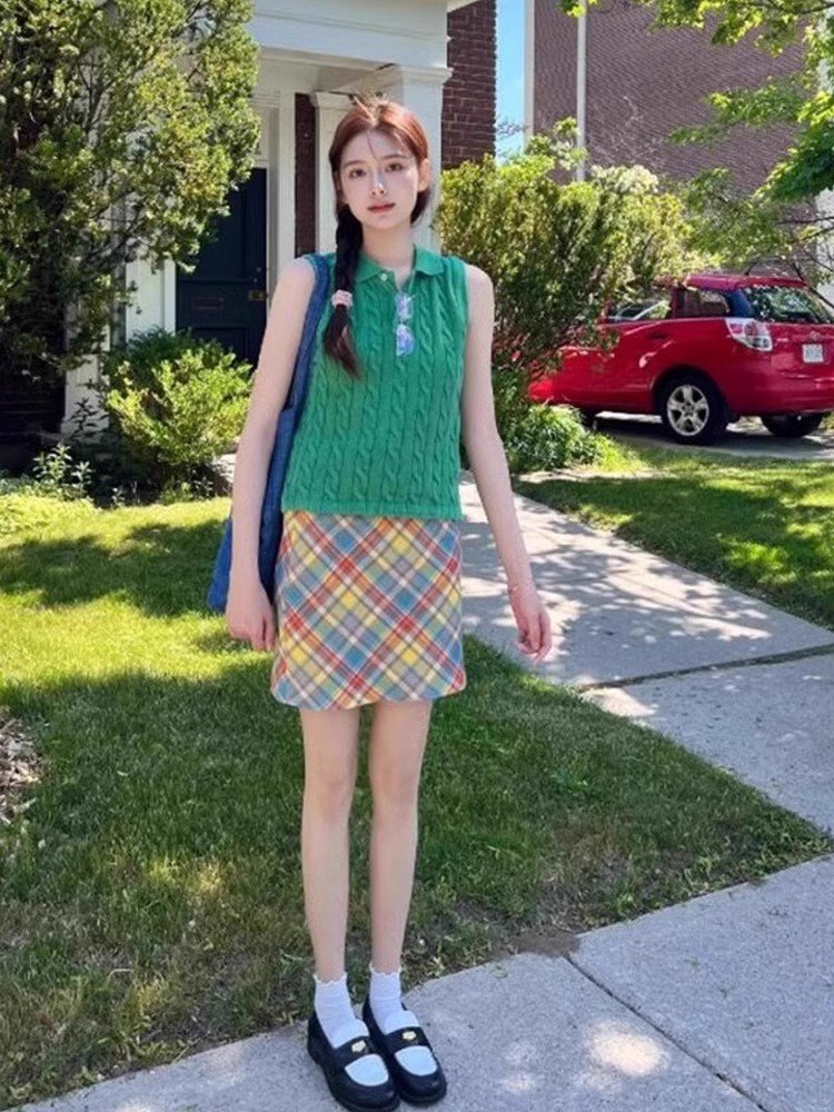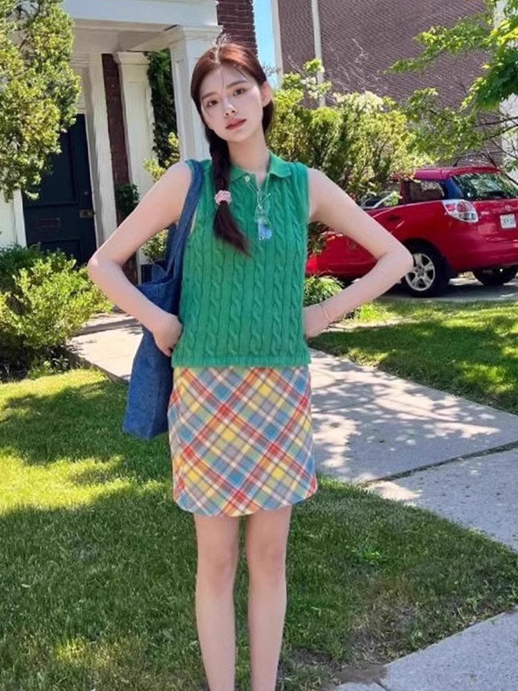 绿色针织麻花坎肩无袖t恤冰丝短款POLO