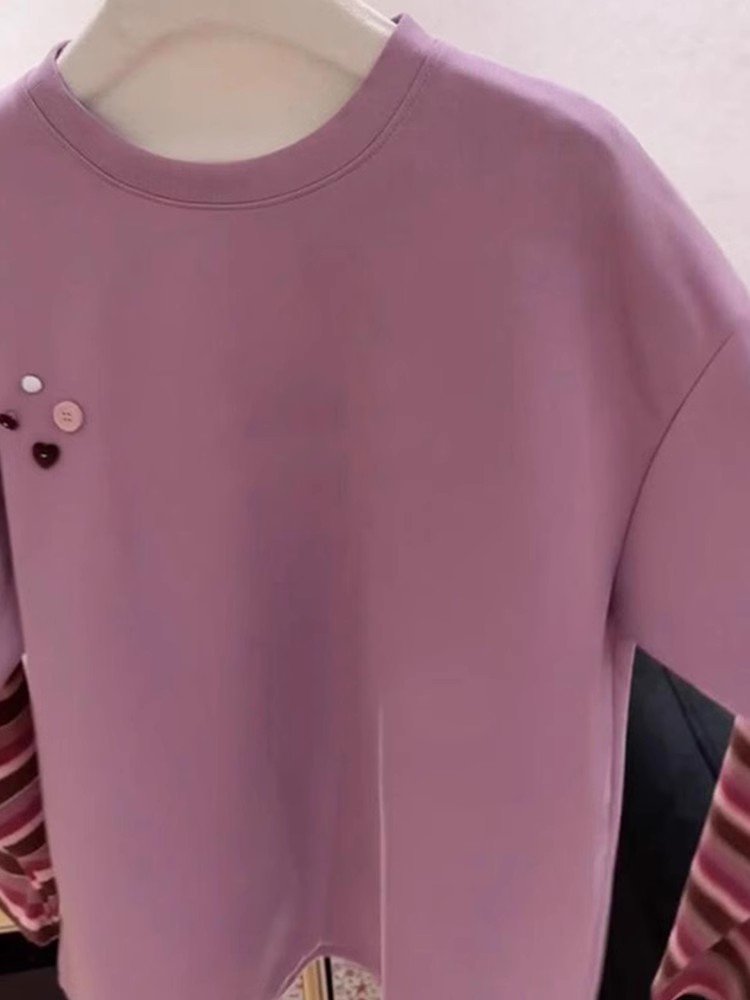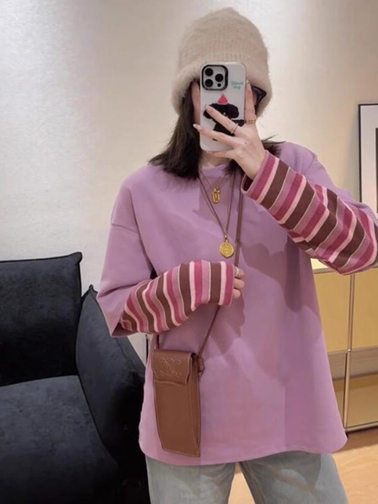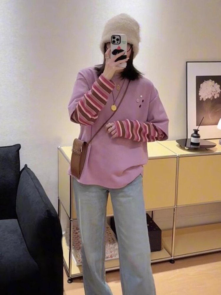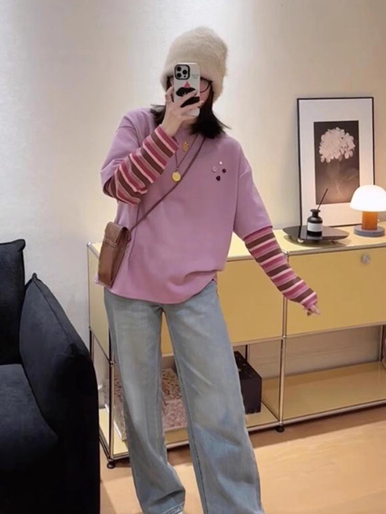 粉色假两件正肩长袖t恤打底衫设计感内搭宽