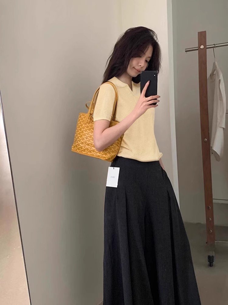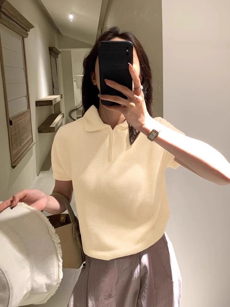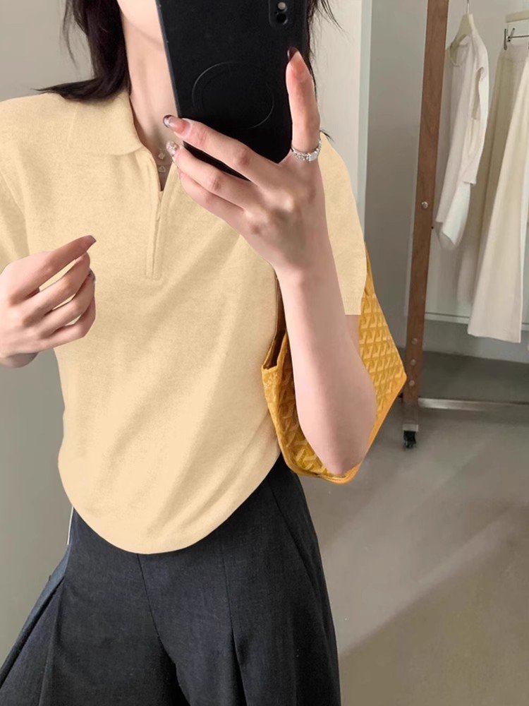 韩系黄色针织POLO衫短款正肩冰丝t恤女