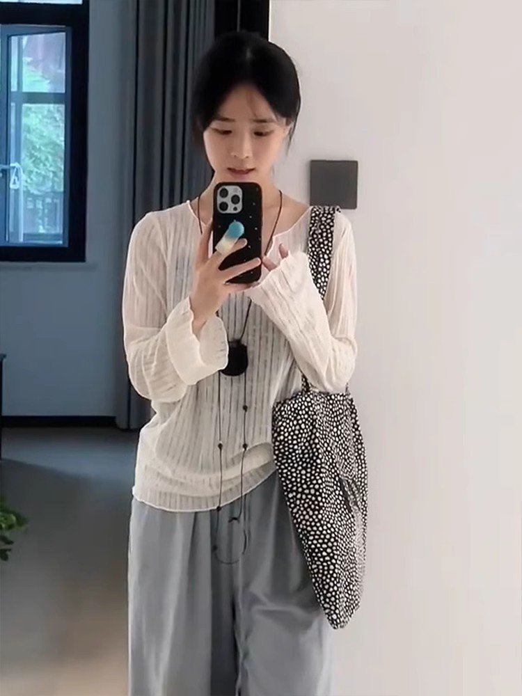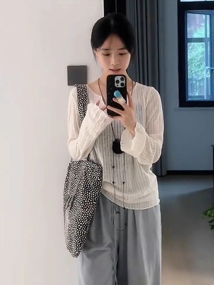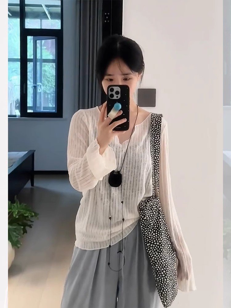白色冰丝v领大领口长袖t恤罩衫女夏季外搭