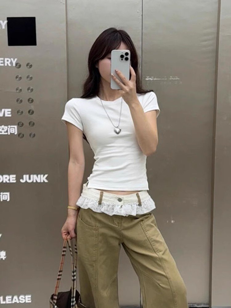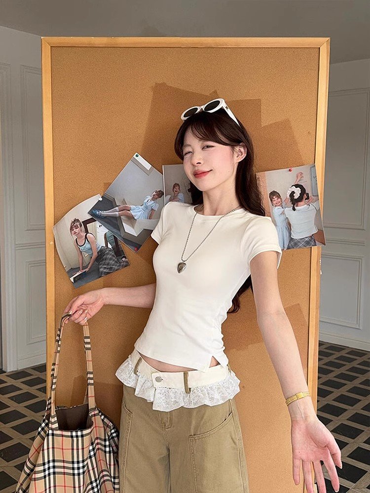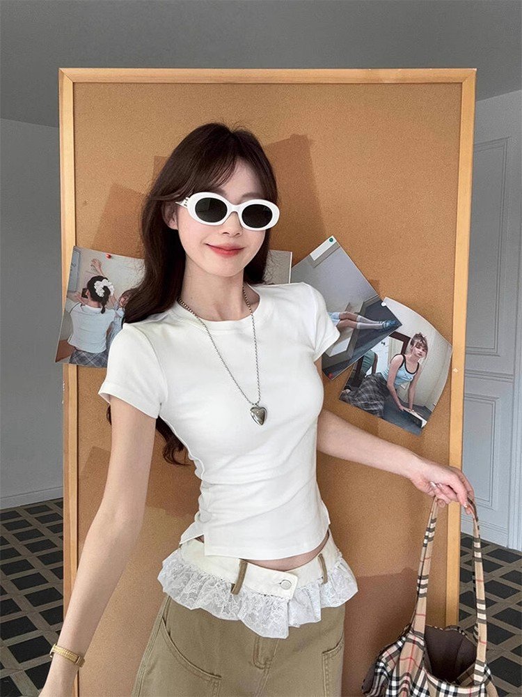 韩系白色开叉短袖正肩t恤女夏季甜辣小个子