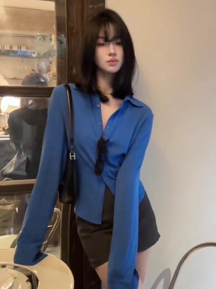 克莱因蓝色polo衫春秋女上衣薄款开衫翻