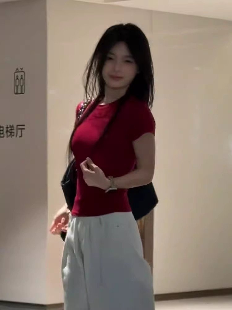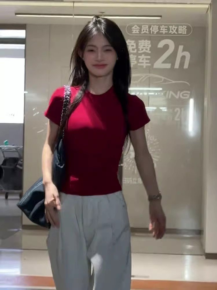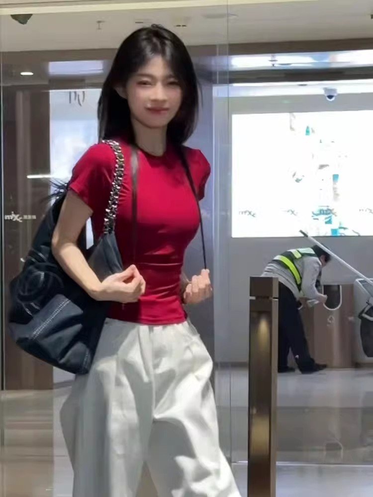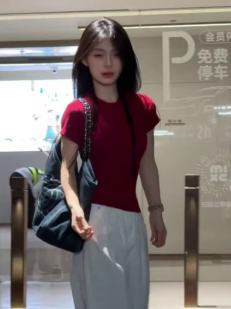 美式辣妹红色正肩飞飞袖短袖t恤衫女夏季小