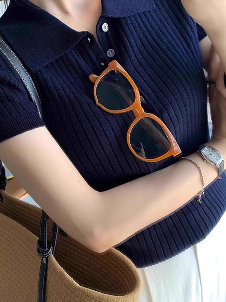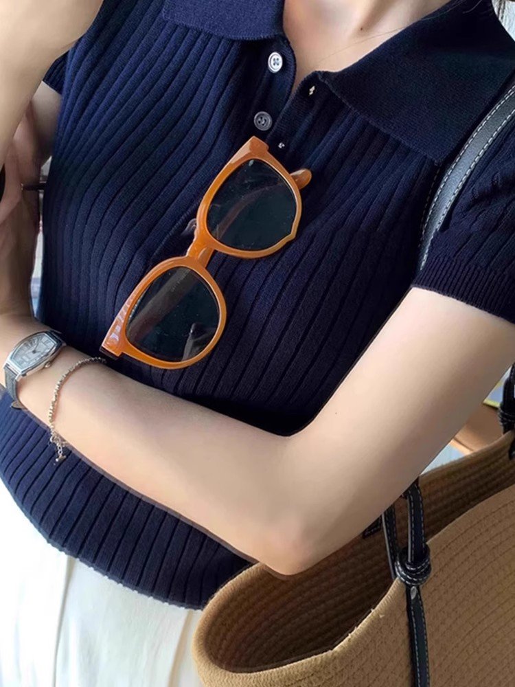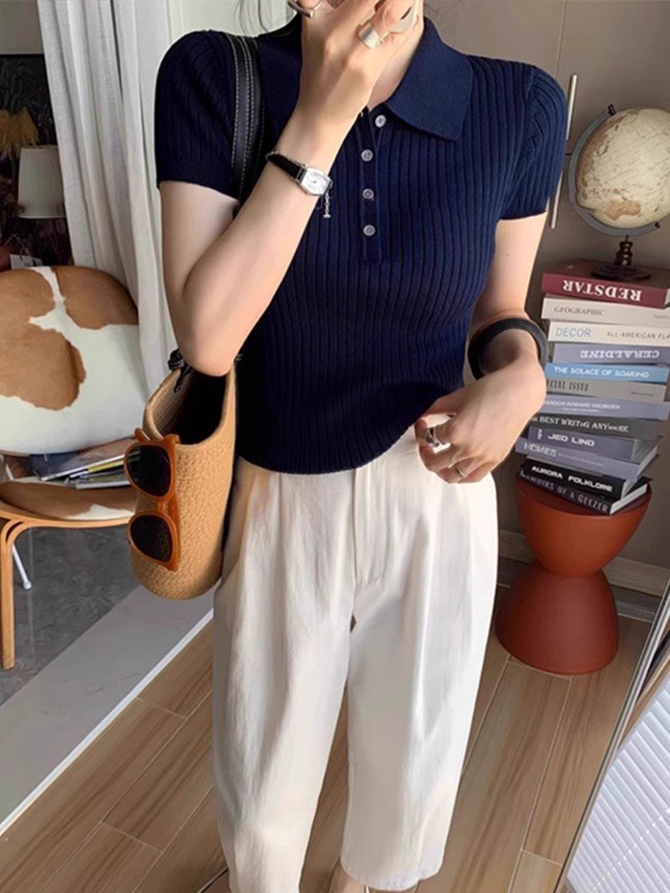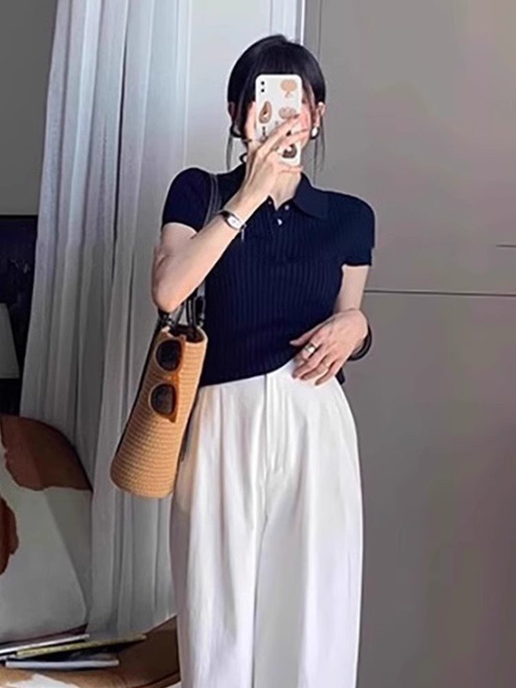 法式藏蓝色polo领针织冰丝短款小上衣女