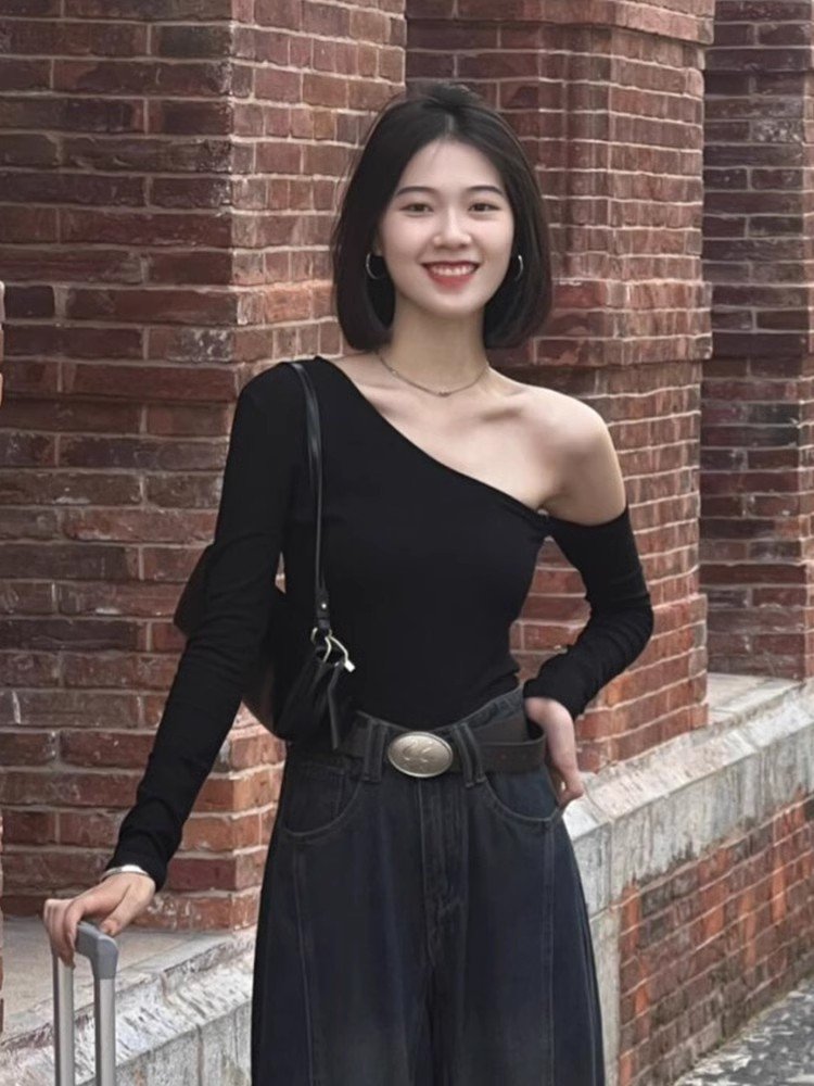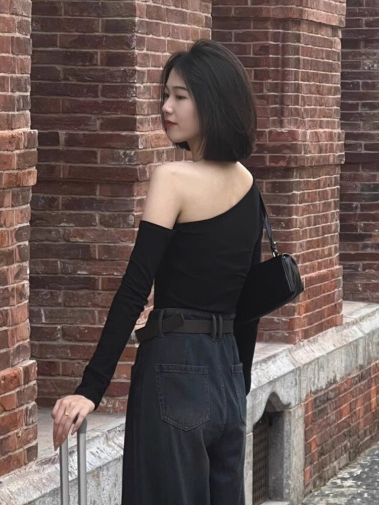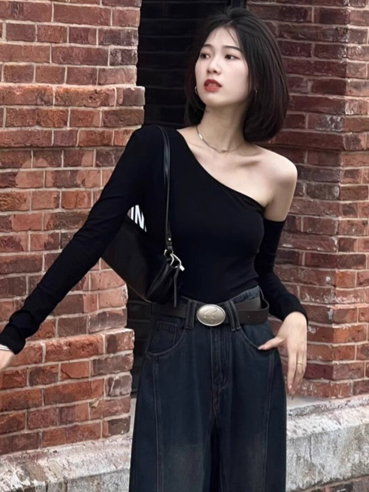 法式棕色斜肩型修身独特漂亮内搭上衣女春秋