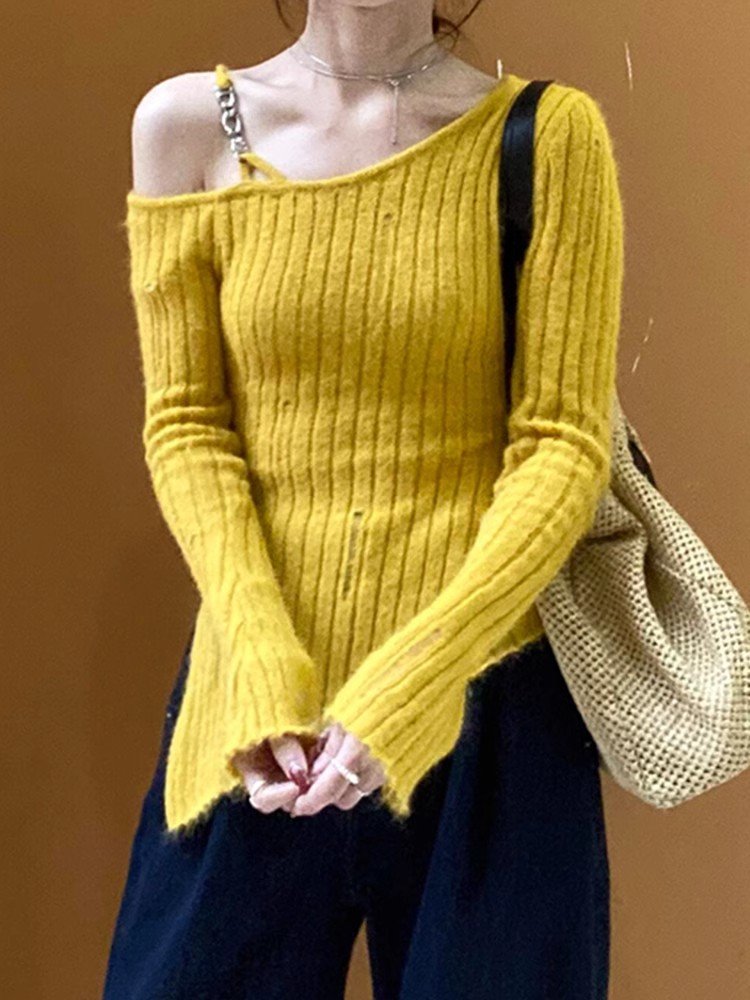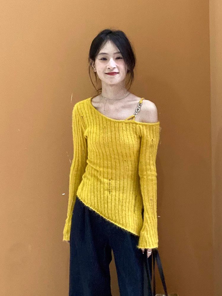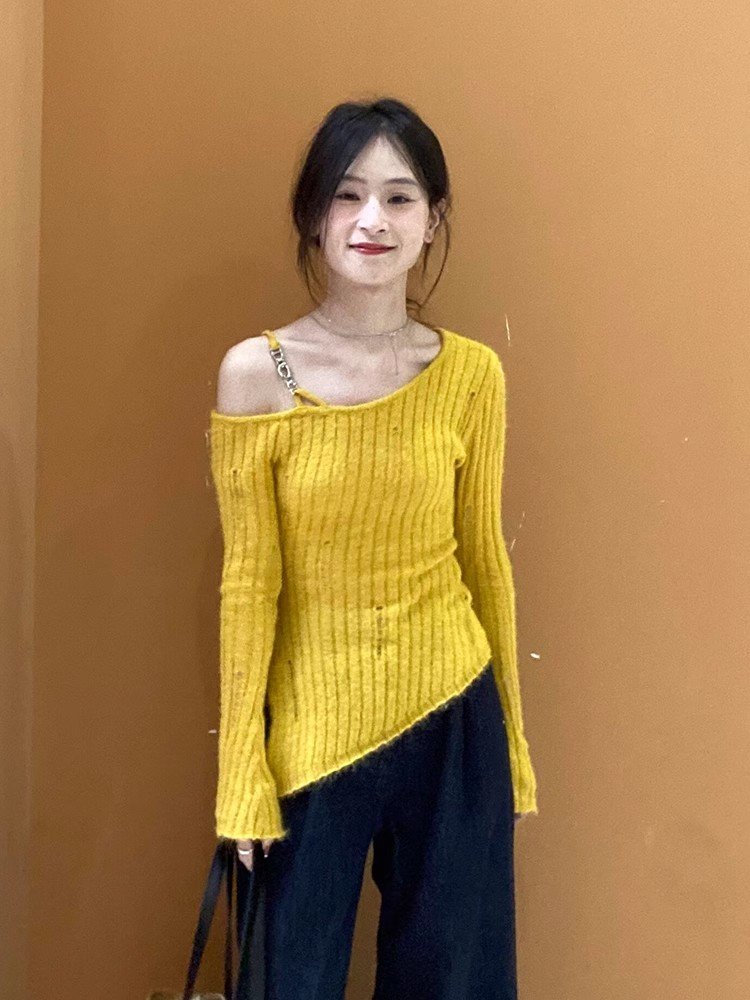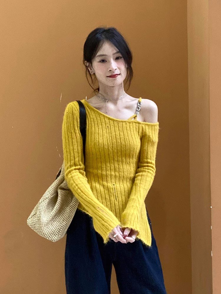 小个子黄色斜肩针织衫独特漂亮内搭上衣女春
