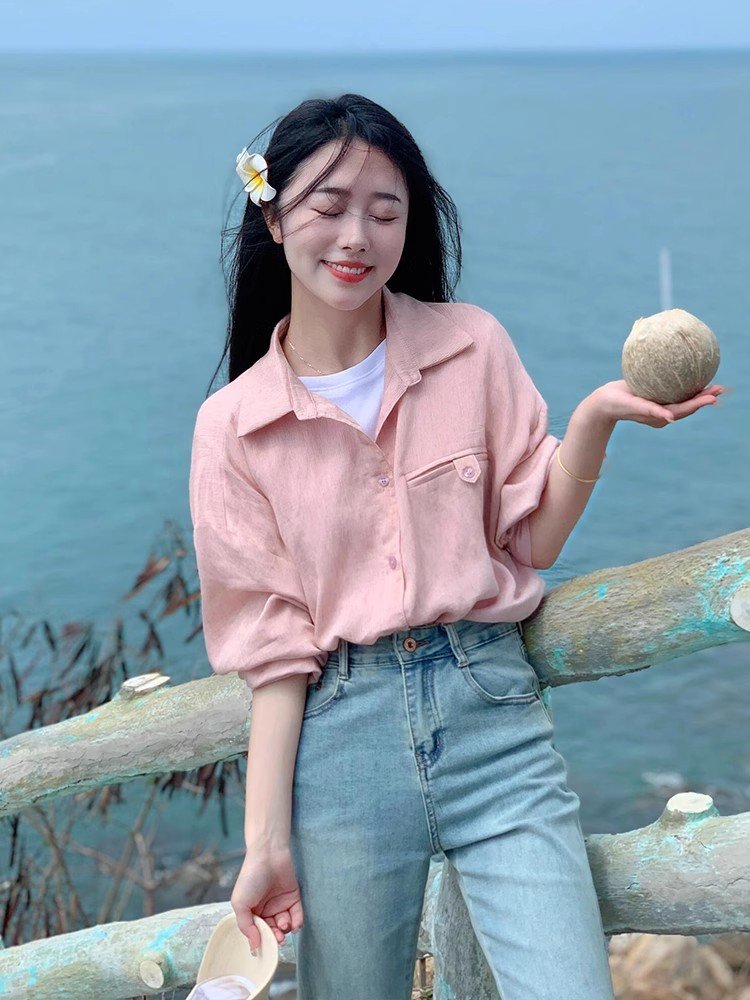 韩系粉色棉麻polo领衬衫外套女早春外搭