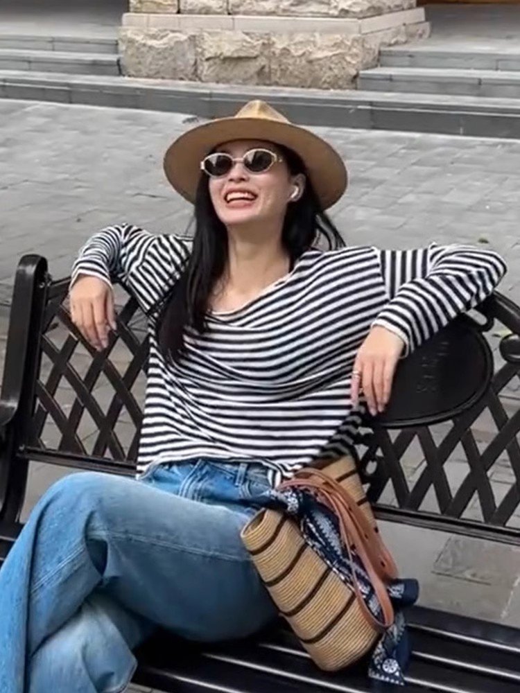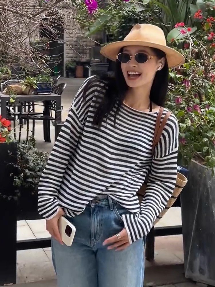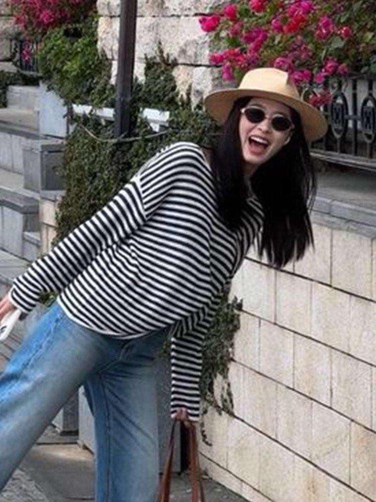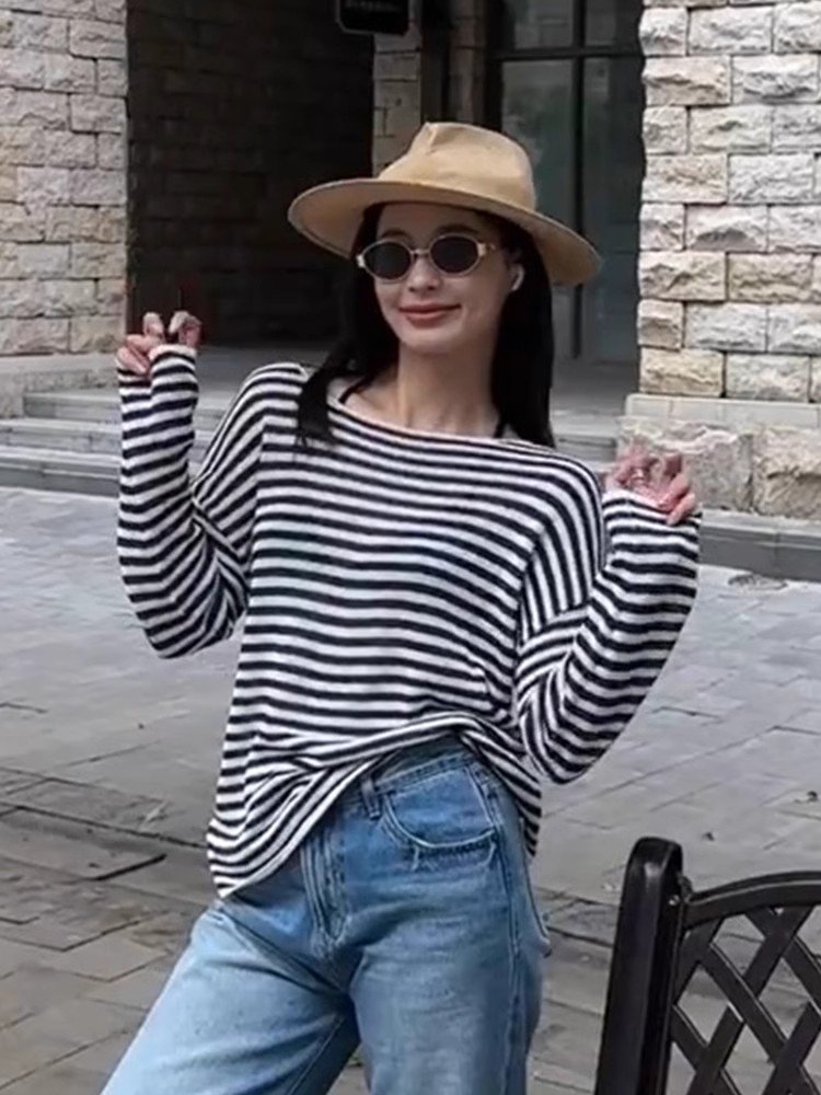 韩系黑白条纹正肩长袖t恤打底衫女春秋季独