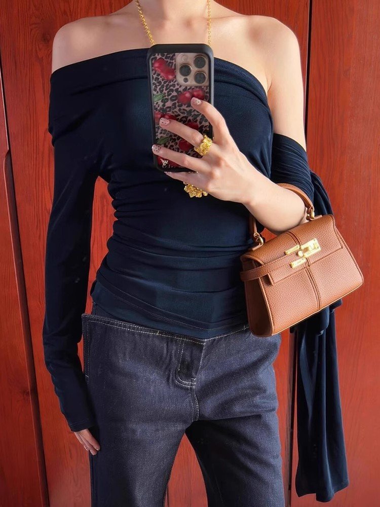 藏蓝色一字领飘带长袖t恤女春秋小个子打底