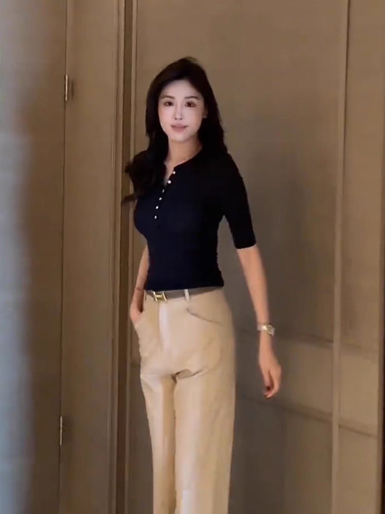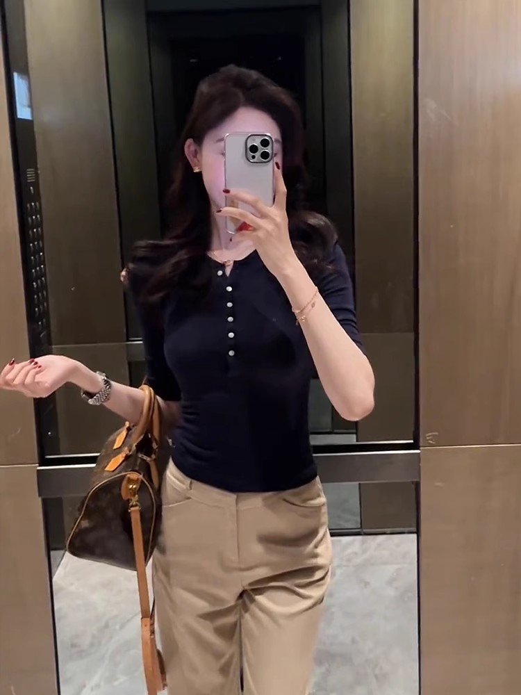 春秋内搭藏蓝色半开领正肩短袖t恤女小个子