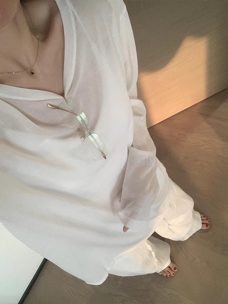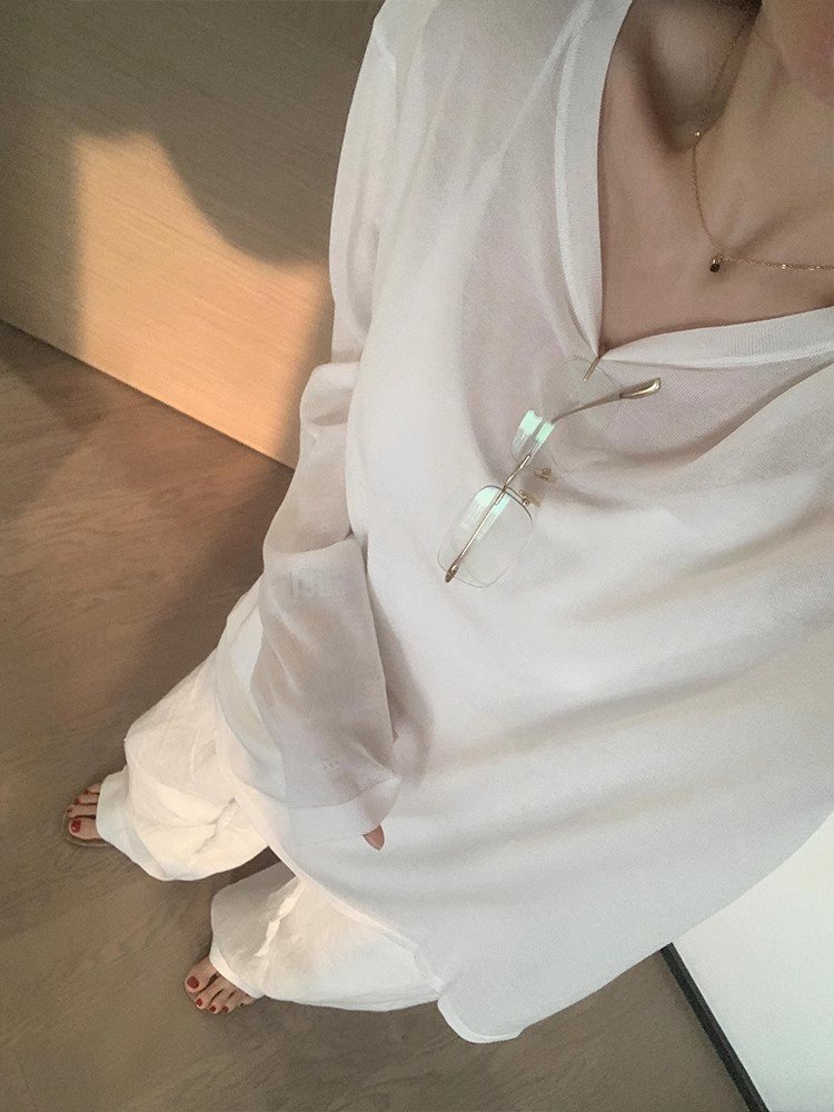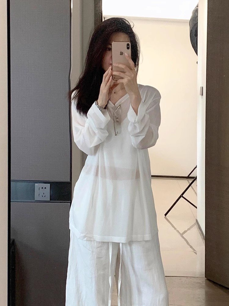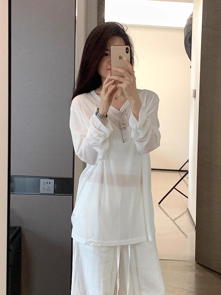韩系白色圆领正肩长袖防晒t恤罩衫女夏季外