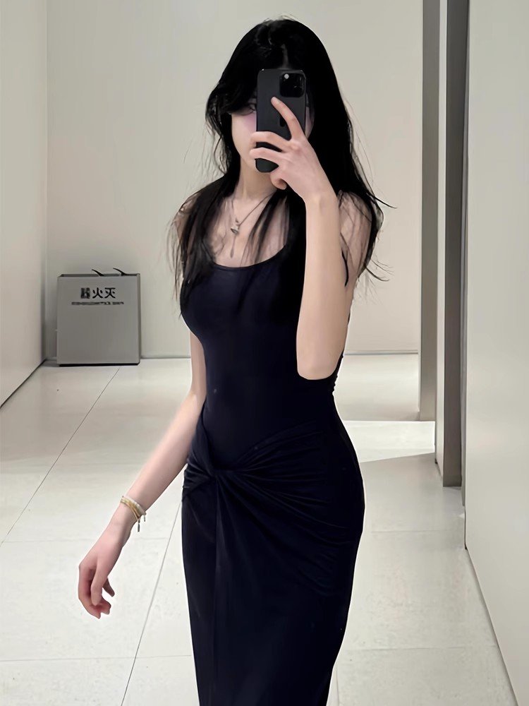 黑色赫本风大领口修身长裙子女夏季茶歇小众