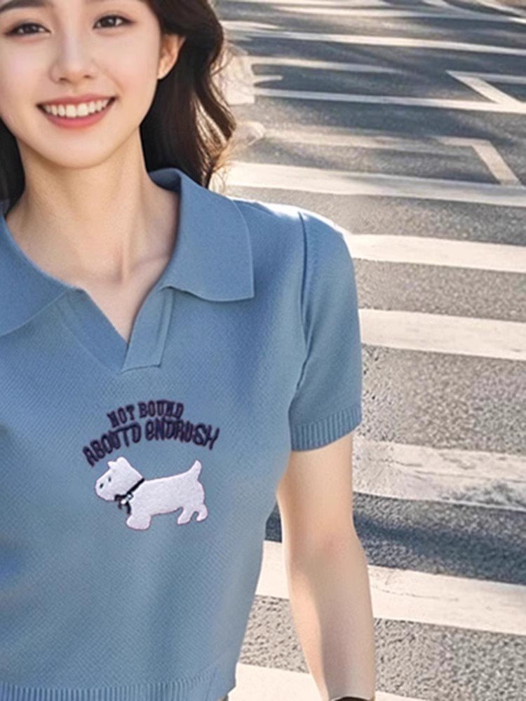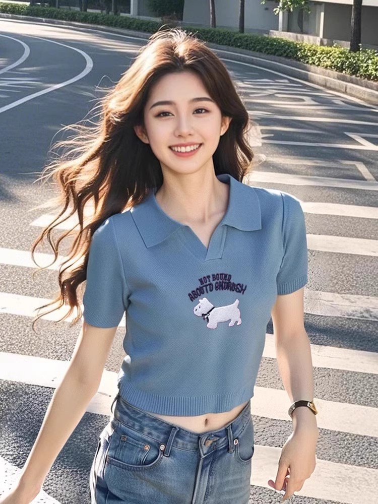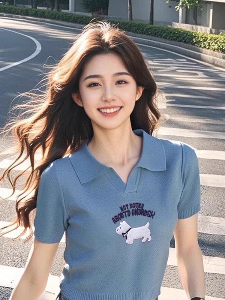 蓝色卡通针织短袖T恤女春夏2025新款宽
