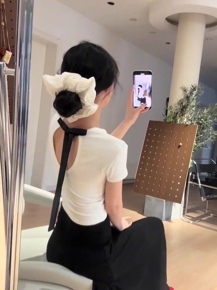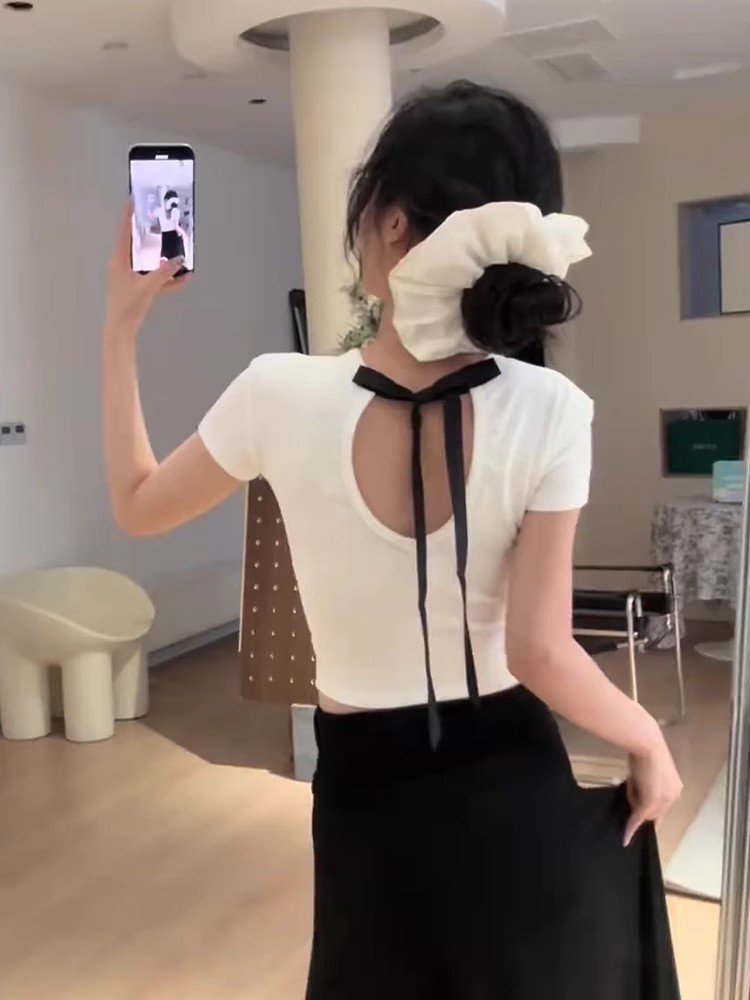 白色露背蝴蝶结短袖正肩t恤女夏甜辣小个子