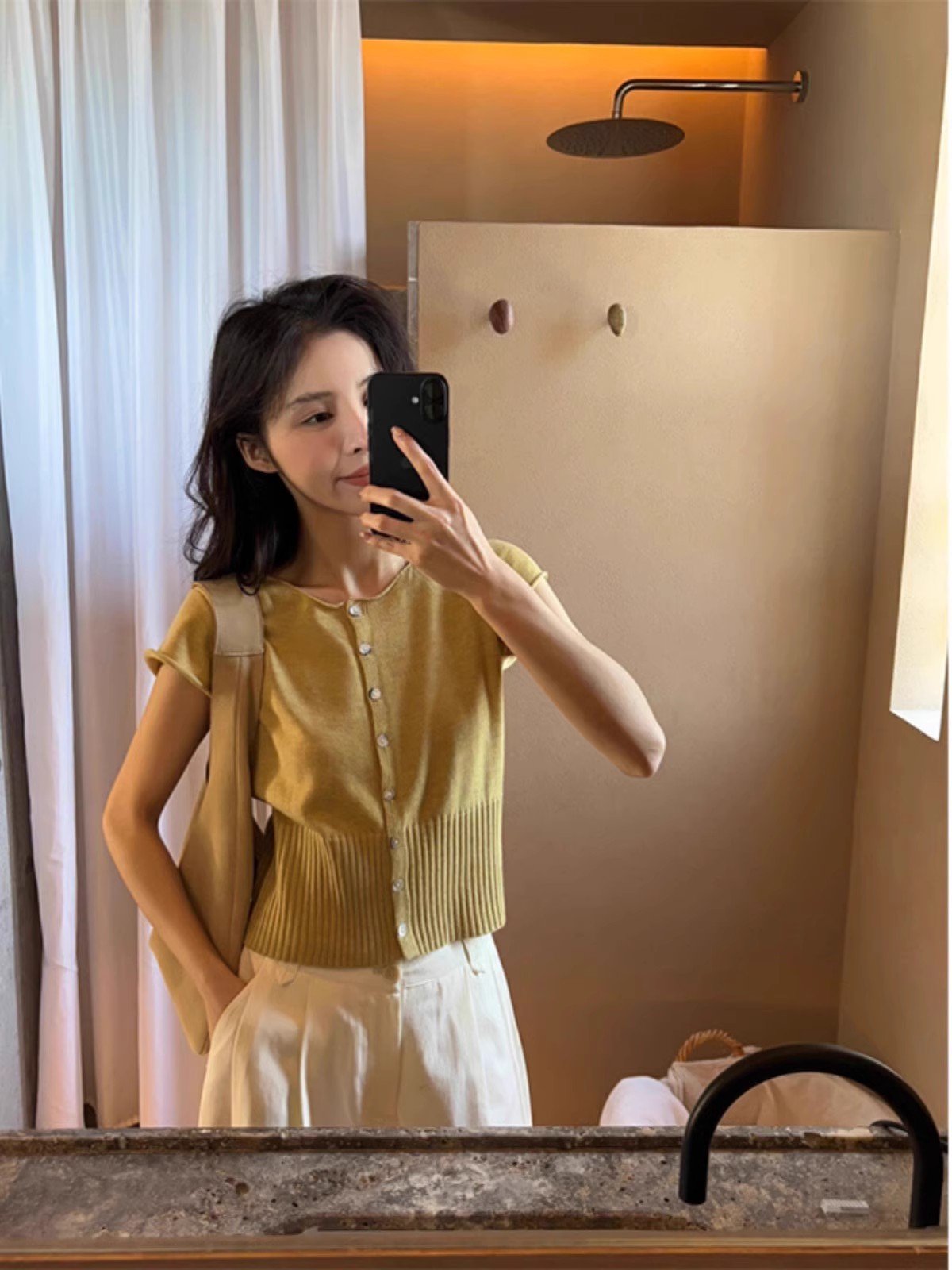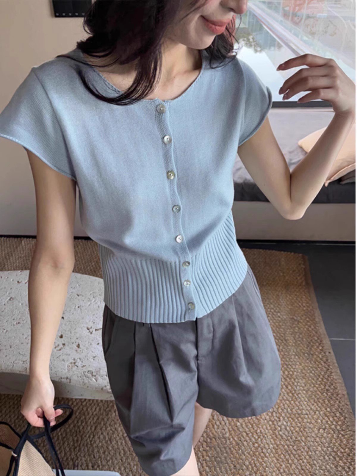 蓝色针织冰丝独特别致小众短款上衣设计感小