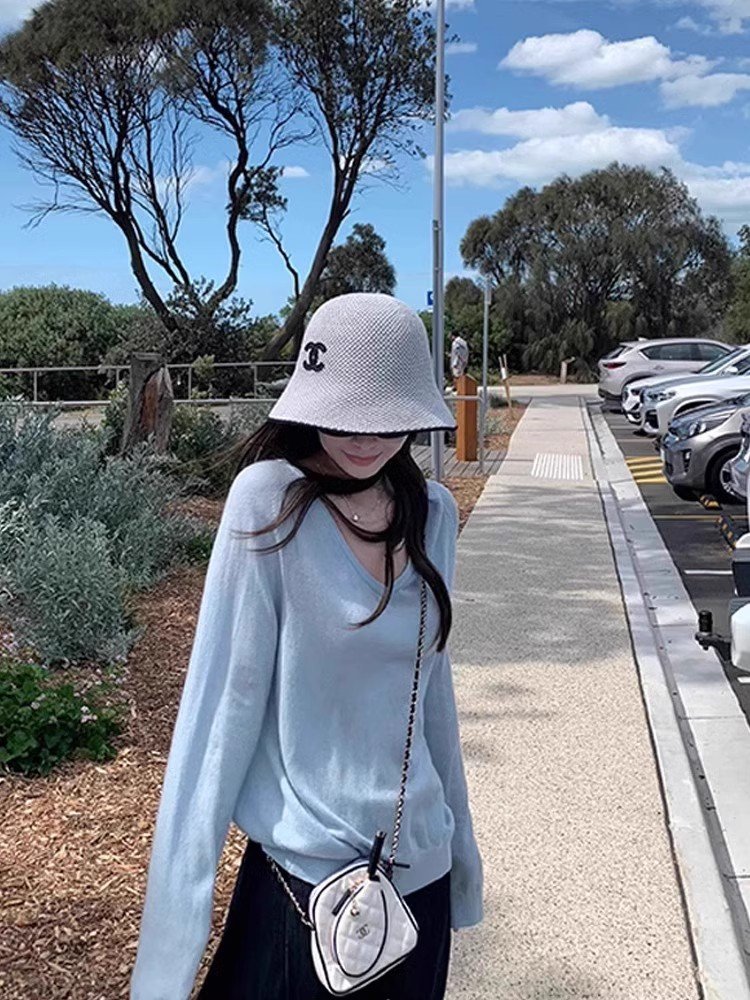 韩系蓝色v领正肩长袖防晒t恤空调衫女夏季