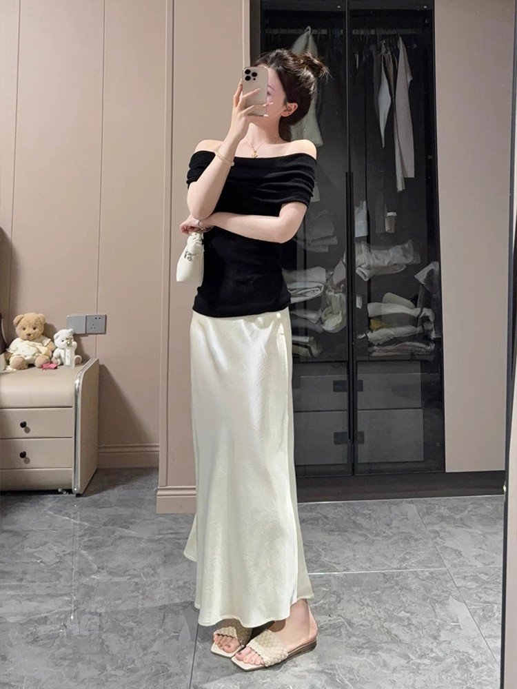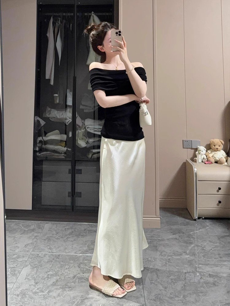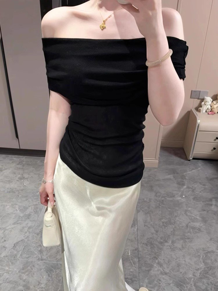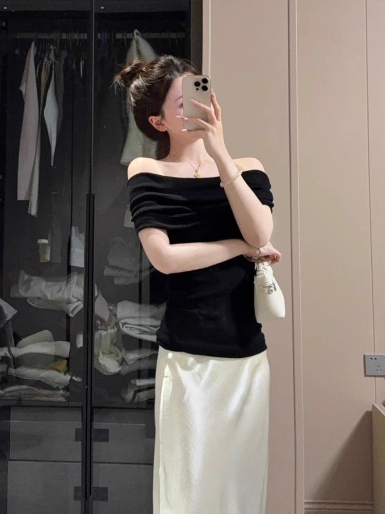 法式别致黑色一字领冰丝针织短袖t恤女夏季