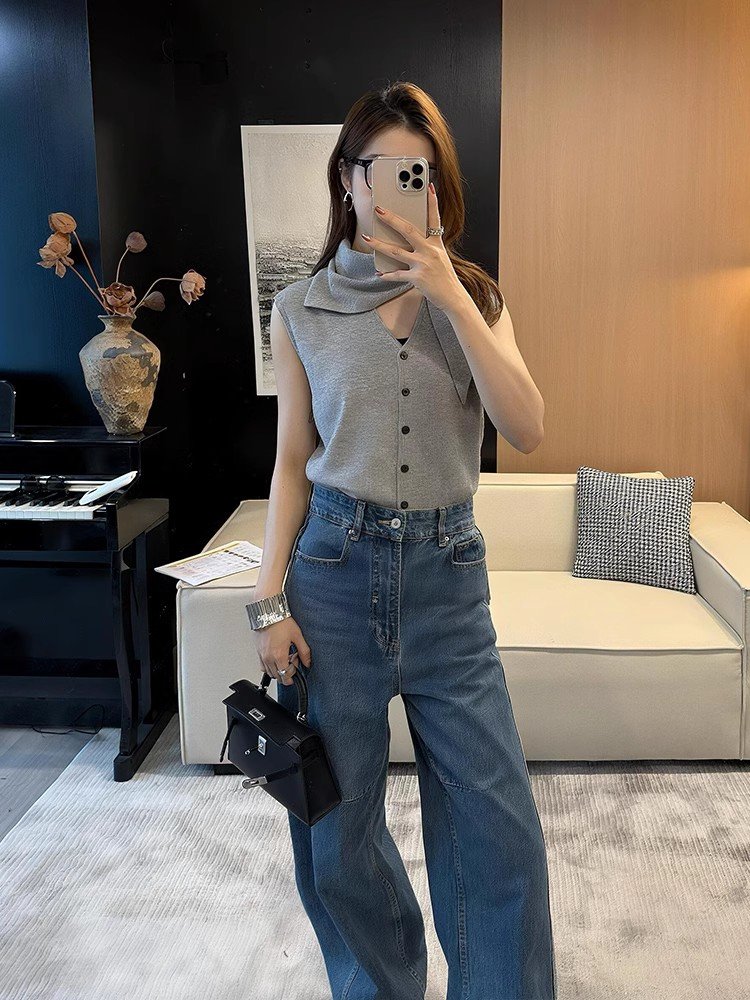韩系灰色v领冰丝针织无袖坎肩t恤女夏季小