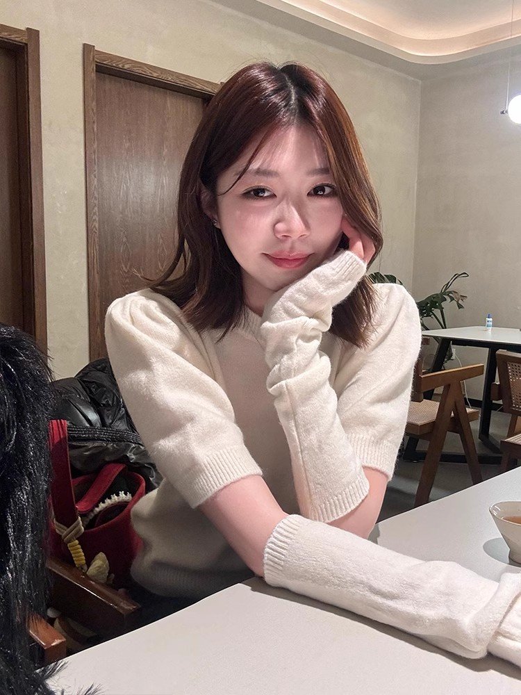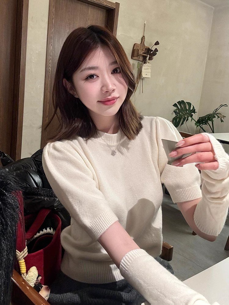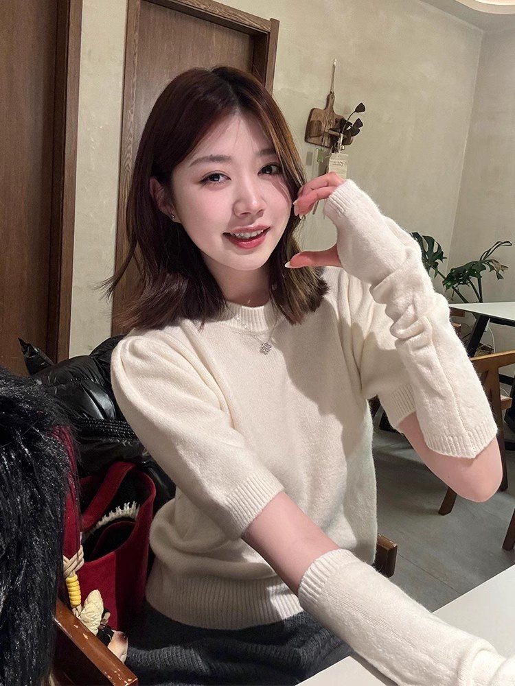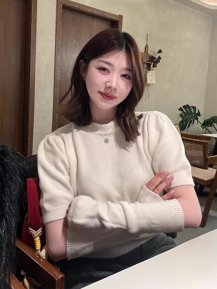 法式白色泡泡袖带袖套针织冰丝短款上衣女春