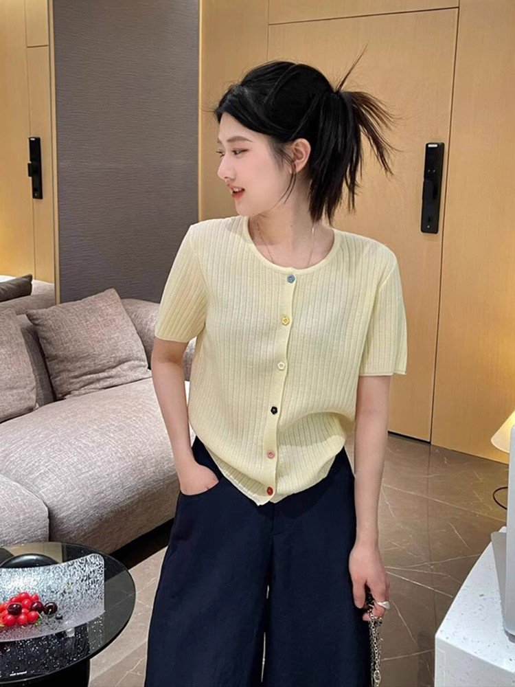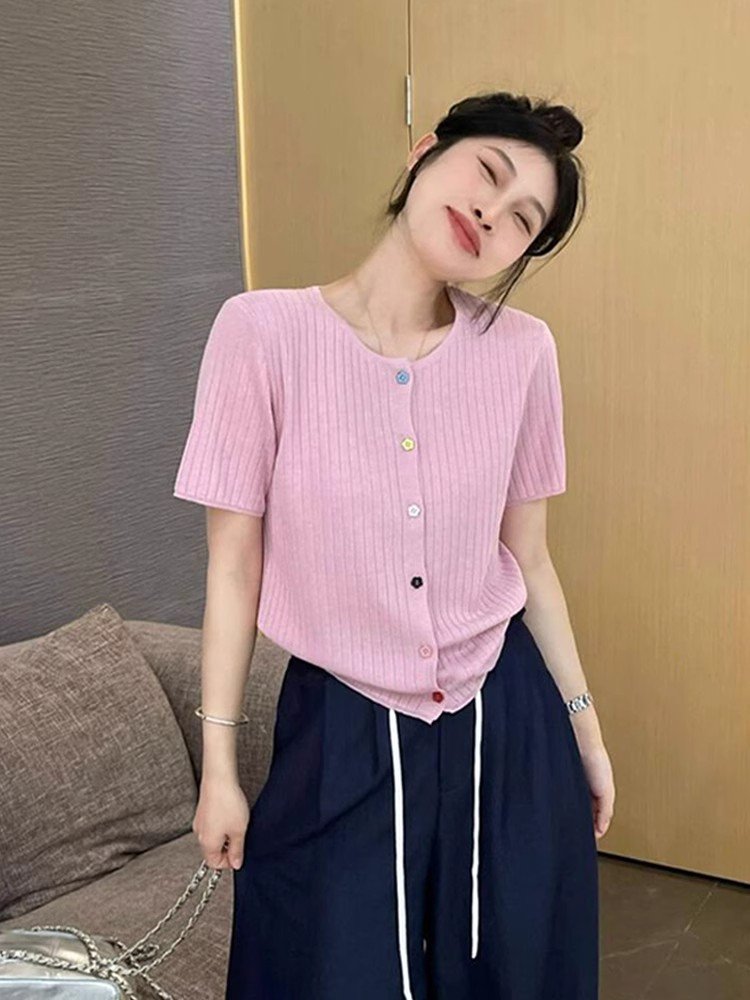 韩系粉色圆领冰丝针织正肩短袖t恤女夏季小